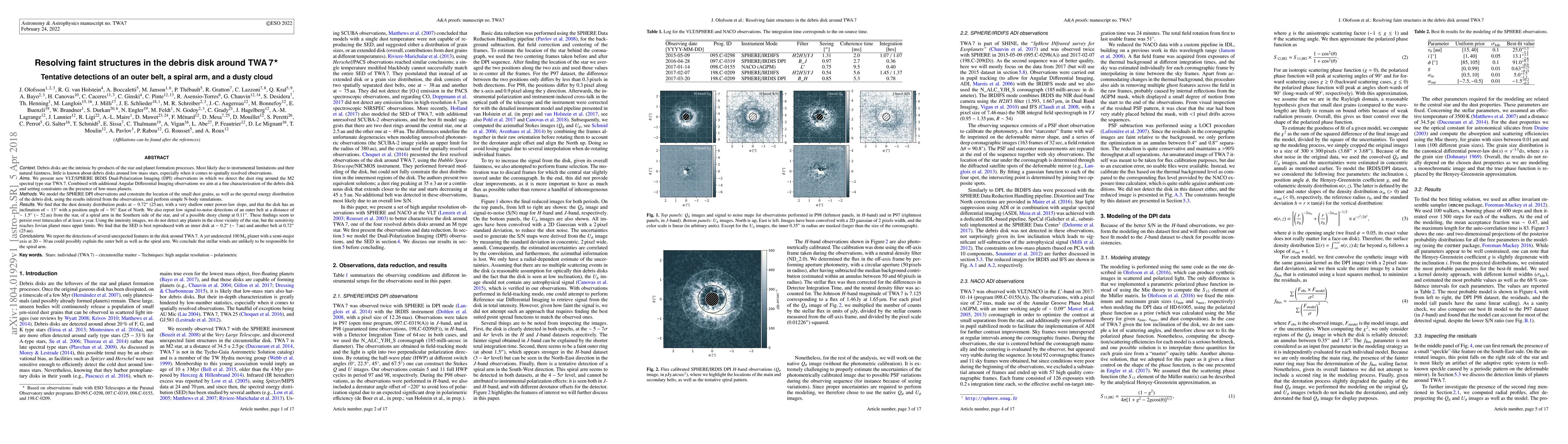Debris disks are the intrinsic by-products of the star and planet formation processes. Most likely due to instrumental limitations and their natural faintness, little is known about debris disks around low-mass stars, especially when it comes to spatially resolved observations. We present new VLT/SPHERE IRDIS Dual-Polarization Imaging (DPI) observations in which we detect the dust ring around the M2 spectral type star TWA\,7. Combined with additional Angular Differential Imaging observations we aim at a fine characterization of the debris disk and setting constraints on the presence of low-mass planets. We model the SPHERE DPI observations and constrain the location of the small dust grains, as well as the spectral energy distribution of the debris disk, using the results inferred from the observations, and perform simple N-body simulations. We find that the dust density distribution peaks at 25 au, with a very shallow outer power-law slope, and that the disk has an inclination of 13 degrees with a position angle of 90 degrees East of North. We also report low signal-to-noise detections of an outer belt at a distance of ~52 au from the star, of a spiral arm in the Southern side of the star, and of a possible dusty clump at 3.9 au. These findings seem to persist over timescales of at least a year. Using the intensity images, we do not detect any planets in the close vicinity of the star, but the sensitivity reaches Jovian planet mass upper limits. We find that the SED is best reproduced with an inner disk at 7 au and another belt at 25 au. We report the detections of several unexpected features in the disk around TWA\,7. A yet undetected 100 M$_\oplus$ planet with a semi-major axis at 20-30 au could possibly explain the outer belt as well as the spiral arm. We conclude that stellar winds are unlikely to be responsible for the spiral arm.