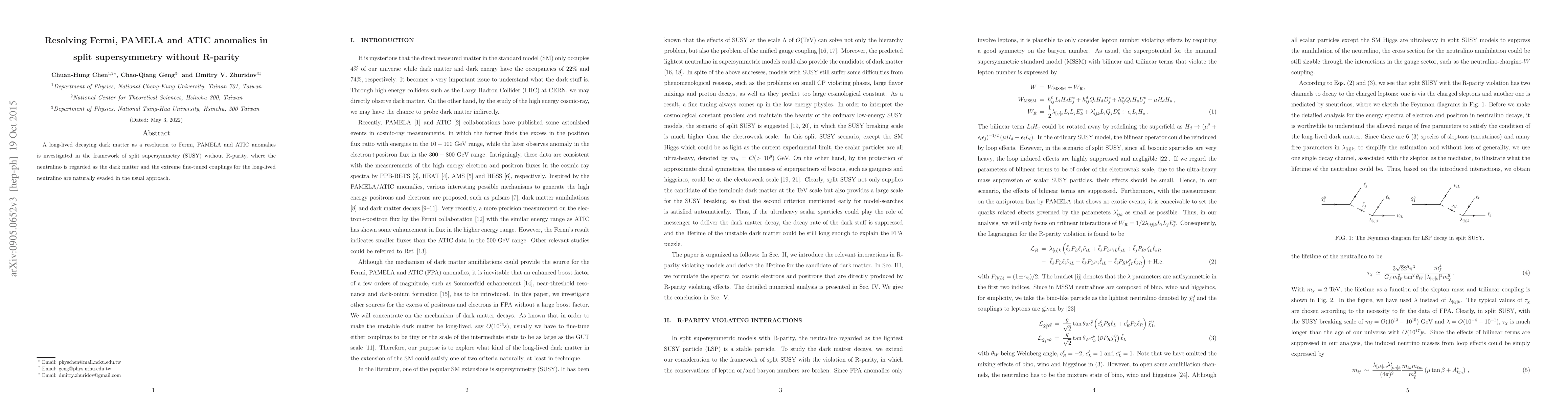 This paper explores a long-lived decaying dark matter in split supersymmetry without R-parity to resolve Fermi, PAMELA, and ATIC anomalies, proposing that the neutralino serves as the dark matter while avoiding the extreme fine-tuning typically required.