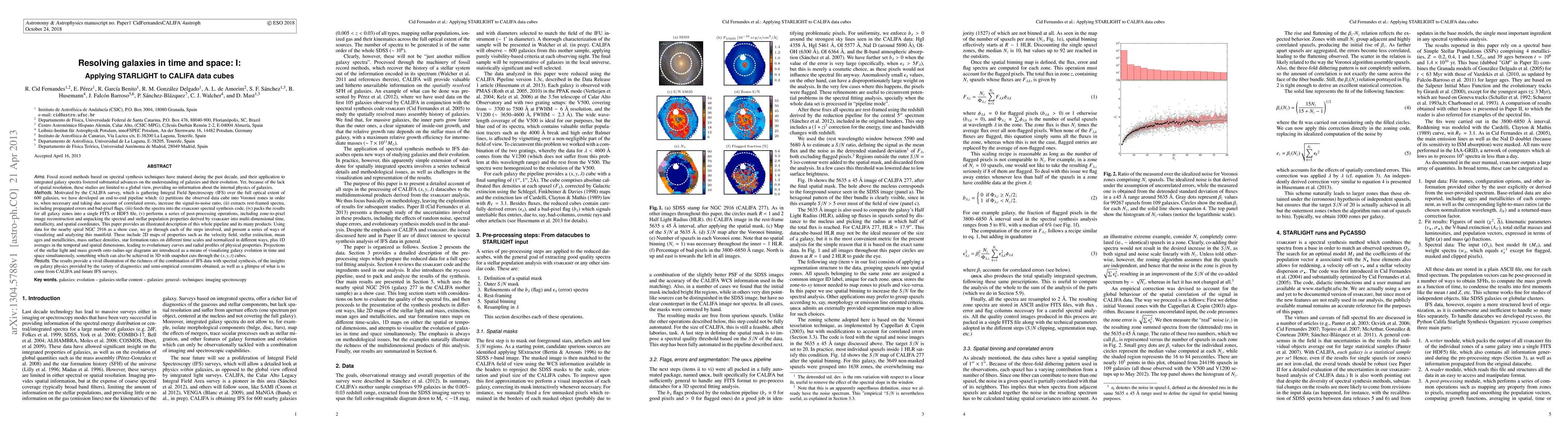 Fossil record methods based on spectral synthesis techniques have matured over the past decade, and their application to integrated galaxy spectra fostered substantial advances on the understanding of galaxies and their evolution. Yet, because of the lack of spatial resolution, these studies are limited to a global view, providing no information about the internal physics of galaxies. Motivated by the CALIFA survey, which is gathering Integral Field Spectroscopy over the full optical extent of 600 galaxies, we have developed an end-to-end pipeline which: (i) partitions the observed data cube into Voronoi zones in order to, when necessary and taking due account of correlated errors, increase the S/N, (ii) extracts spectra, including propagated errors and bad-pixel flags, (iii) feeds the spectra into the STARLIGHT spectral synthesis code, (iv) packs the results for all galaxy zones into a single file, (v) performs a series of post-processing operations, including zone-to-pixel image reconstruction and unpacking the spectral and stellar population properties into multi-dimensional time, metallicity, and spatial coordinates. This paper provides an illustrated description of this whole pipeline and its products. Using data for the nearby spiral NGC 2916 as a show case, we go through each of the steps involved, presenting ways of visualizing and analyzing this manifold. These include 2D maps of properties such as the v-field, stellar extinction, mean ages and metallicities, mass surface densities, star formation rates on different time scales and normalized in different ways, 1D averages in the temporal and spatial dimensions, projections of the stellar light and mass growth (x,y,t) cubes onto radius-age diagrams, etc. The results illustrate the richness of the combination of IFS data with spectral synthesis, providing a glimpse of what is to come from CALIFA and future surveys. (Abridged)