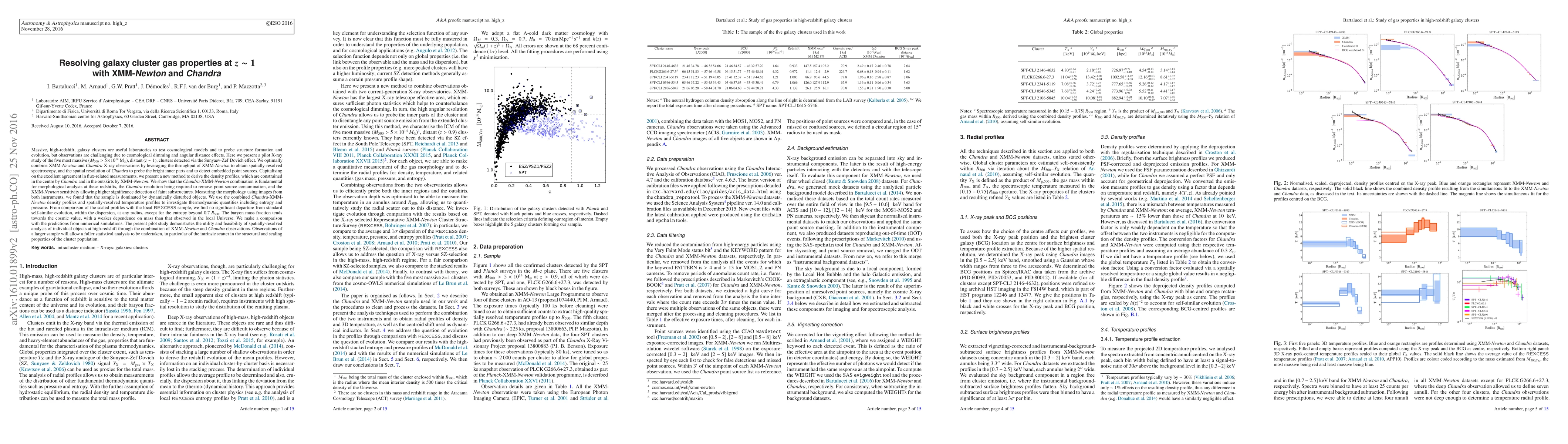 This study combines XMM-Newton and Chandra X-ray observations to analyze the gas properties of five massive, distant galaxy clusters at z~1. The combined data allow for spatially-resolved spectroscopy and detailed morphological analysis, revealing no significant deviation from self-similar evolution in thermodynamic quantities, except for entropy beyond 0.7$R_{500}$. This pilot study highlights the potential of using XMM and Chandra together for high-redshift cluster analysis.