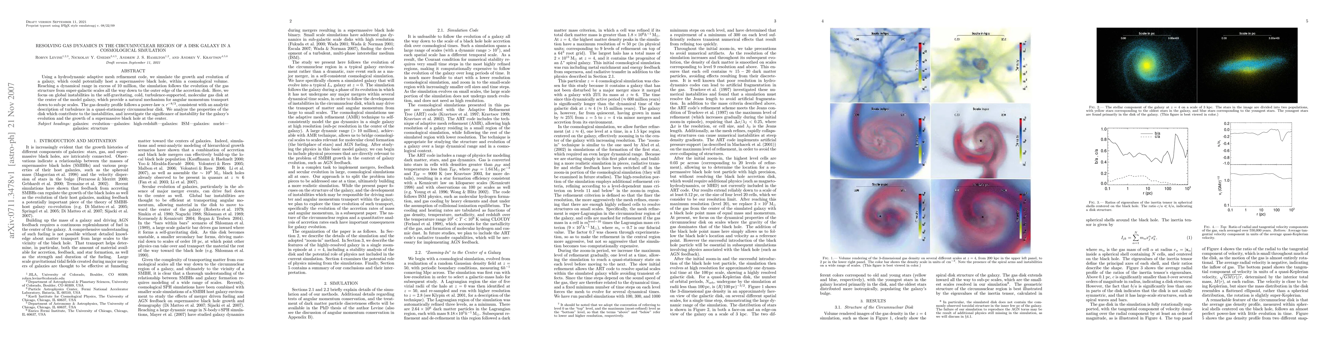 Using a hydrodynamic adaptive mesh refinement code, we simulate the growth and evolution of a galaxy, which could potentially host a supermassive black hole, within a cosmological volume. Reaching a dynamical range in excess of 10 million, the simulation follows the evolution of the gas structure from super-galactic scales all the way down to the outer edge of the accretion disk. Here, we focus on global instabilities in the self-gravitating, cold, turbulence-supported, molecular gas disk at the center of the model galaxy, which provide a natural mechanism for angular momentum transport down to sub-pc scales. The gas density profile follows a power-law scaling as r^-8/3, consistent with an analytic description of turbulence in a quasi-stationary circumnuclear disk. We analyze the properties of the disk which contribute to the instabilities, and investigate the significance of instability for the galaxy's evolution and the growth of a supermassive black hole at the center.