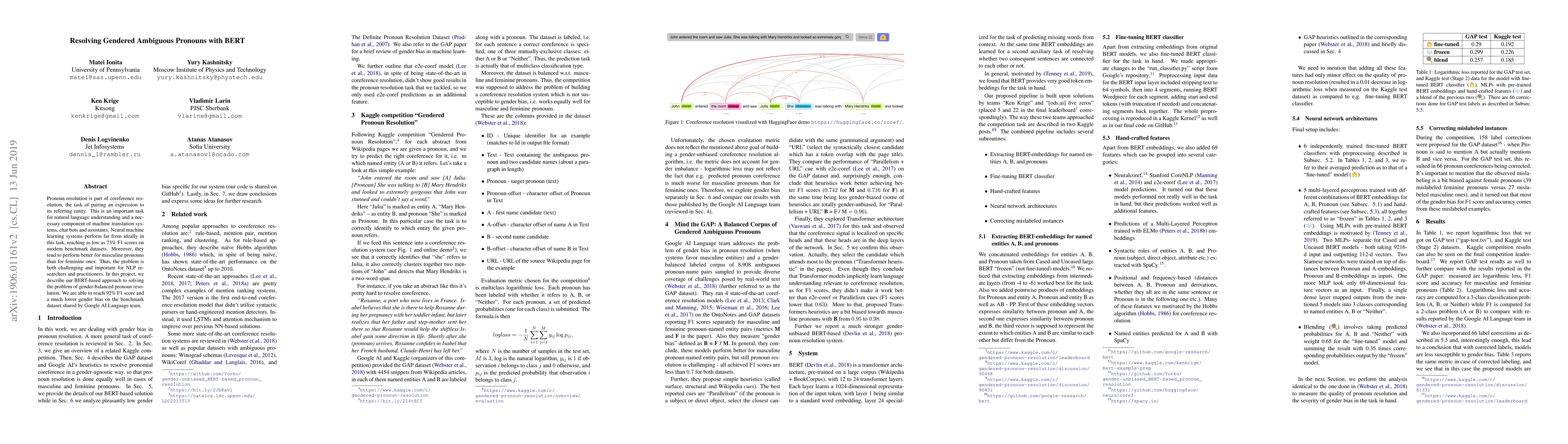 This paper presents a BERT-based method for resolving gendered ambiguous pronouns, achieving a 92% F1 score and significantly reducing gender bias compared to existing neural models. The approach addresses the challenge of gender-balanced pronoun resolution in natural language understanding.