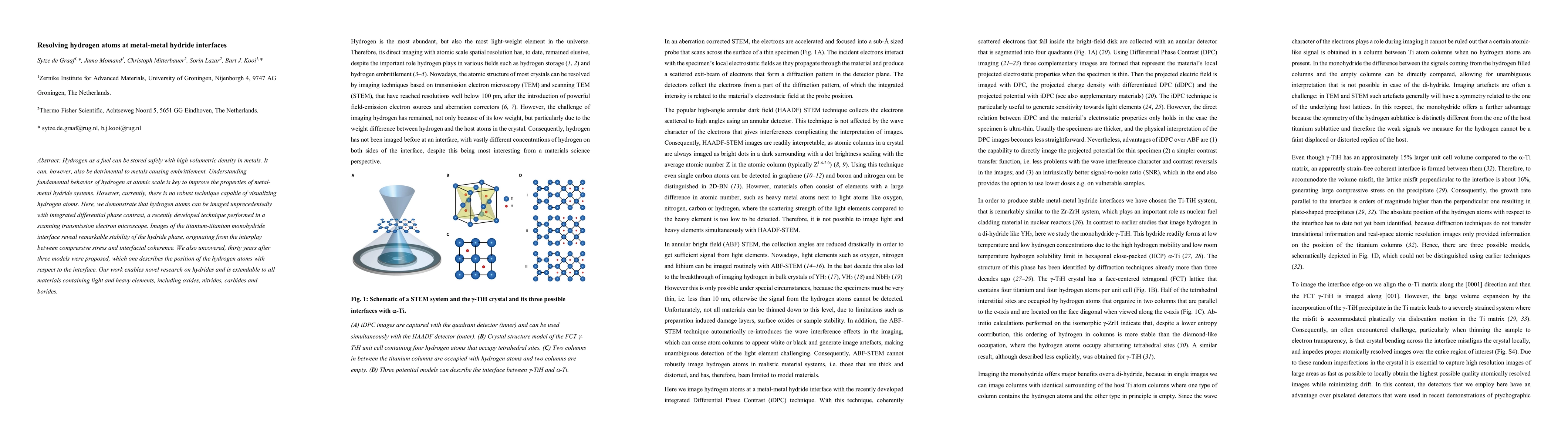 Hydrogen as a fuel can be stored safely with high volumetric density in metals. It can, however, also be detrimental to metals causing embrittlement. Understanding fundamental behavior of hydrogen at atomic scale is key to improve the properties of metal-metal hydride systems. However, currently, there is no robust technique capable of visualizing hydrogen atoms. Here, we demonstrate that hydrogen atoms can be imaged unprecedentedly with integrated differential phase contrast, a recently developed technique performed in a scanning transmission electron microscope. Images of the titanium-titanium monohydride interface reveal remarkable stability of the hydride phase, originating from the interplay between compressive stress and interfacial coherence. We also uncovered, thirty years after three models were proposed, which one describes the position of the hydrogen atoms with respect to the interface. Our work enables novel research on hydrides and is extendable to all materials containing light and heavy elements, including oxides, nitrides, carbides and borides.
