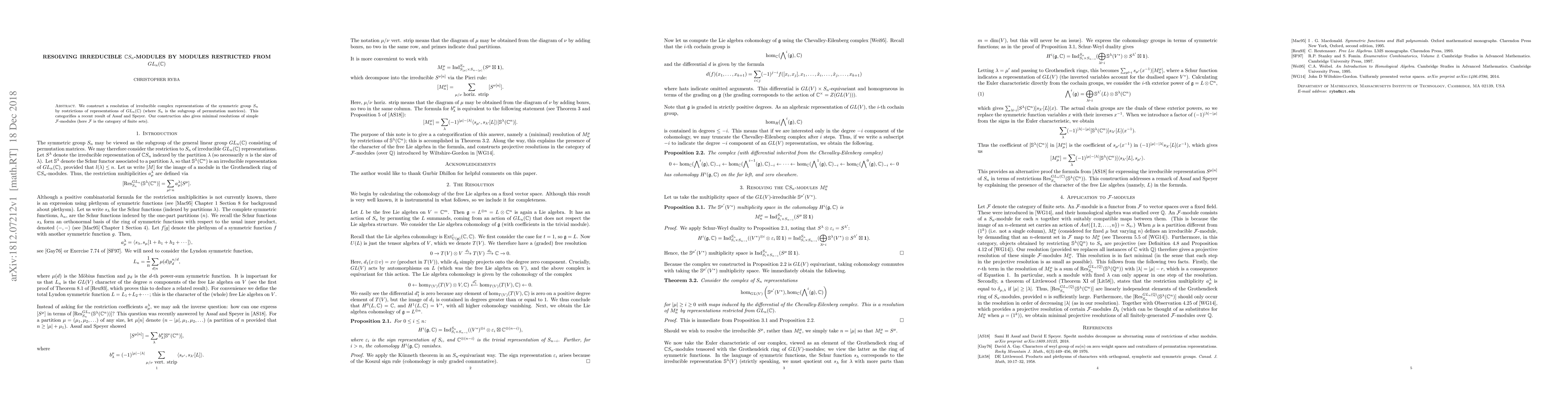 This paper constructs a resolution for irreducible $\mathbb{C}S_n$-modules using restrictions from $GL_n(\mathbb{C})$, categorizing a recent result by Assaf and Speyer and providing minimal resolutions for simple $\mathcal{F}$-modules.