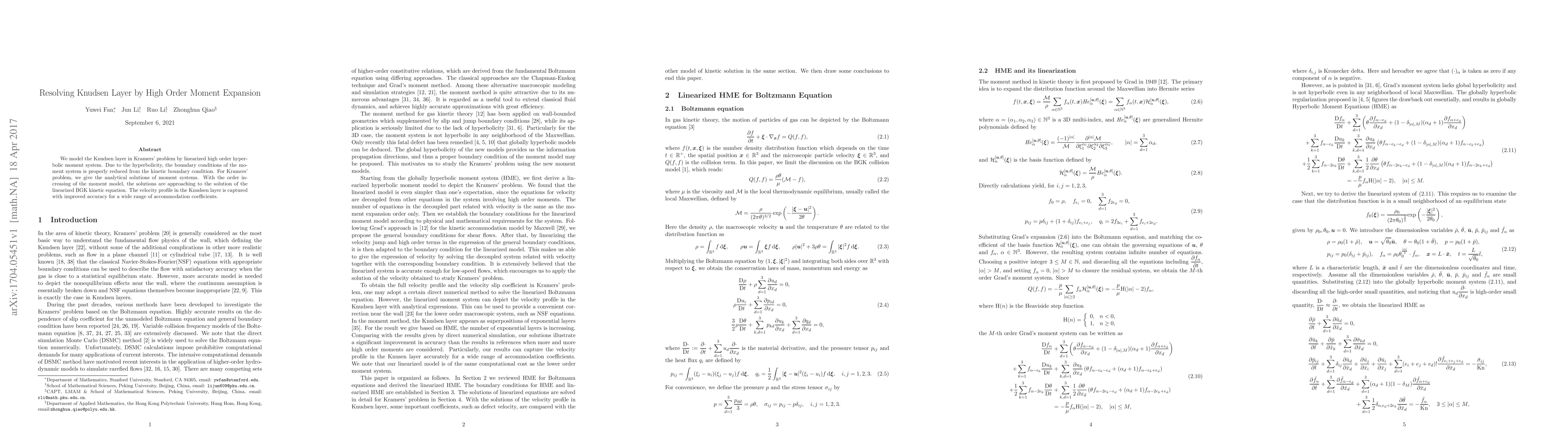 We model the Knudsen layer in Kramers' problem by linearized high order hyperbolic moment system. Due to the hyperbolicity, the boundary conditions of the moment system is properly reduced from the kinetic boundary condition. For Kramers' problem, we give the analytical solutions of moment systems. With the order increasing of the moment model, the solutions are approaching to the solution of the linearized BGK kinetic equation. The velocity profile in the Knudsen layer is captured with improved accuracy for a wide range of accommodation coefficients.