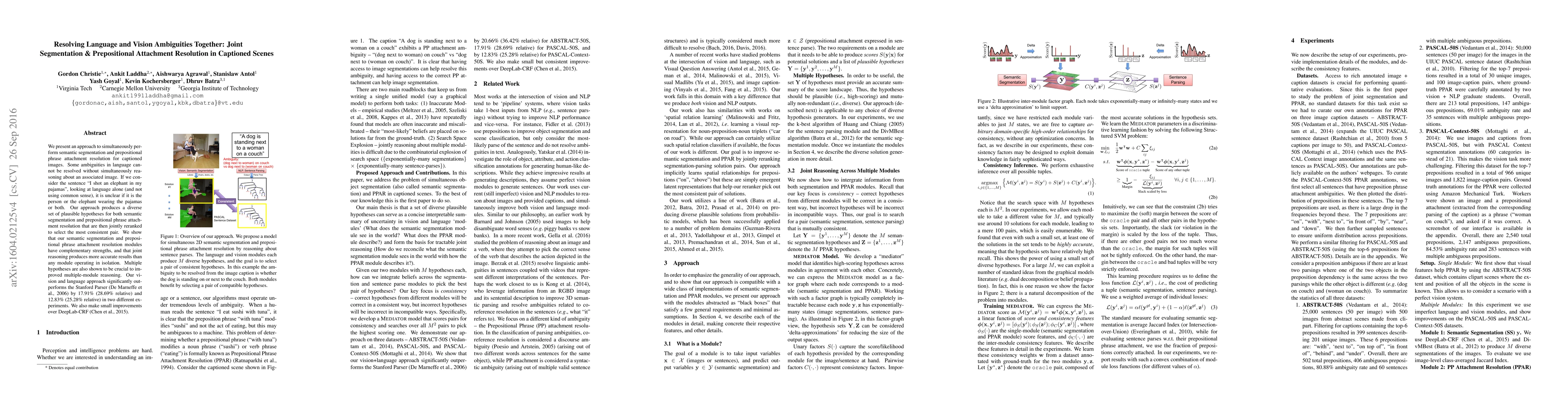 We present an approach to simultaneously perform semantic segmentation and prepositional phrase attachment resolution for captioned images. Some ambiguities in language cannot be resolved without simultaneously reasoning about an associated image. If we consider the sentence "I shot an elephant in my pajamas", looking at language alone (and not using common sense), it is unclear if it is the person or the elephant wearing the pajamas or both. Our approach produces a diverse set of plausible hypotheses for both semantic segmentation and prepositional phrase attachment resolution that are then jointly reranked to select the most consistent pair. We show that our semantic segmentation and prepositional phrase attachment resolution modules have complementary strengths, and that joint reasoning produces more accurate results than any module operating in isolation. Multiple hypotheses are also shown to be crucial to improved multiple-module reasoning. Our vision and language approach significantly outperforms the Stanford Parser (De Marneffe et al., 2006) by 17.91% (28.69% relative) and 12.83% (25.28% relative) in two different experiments. We also make small improvements over DeepLab-CRF (Chen et al., 2015).