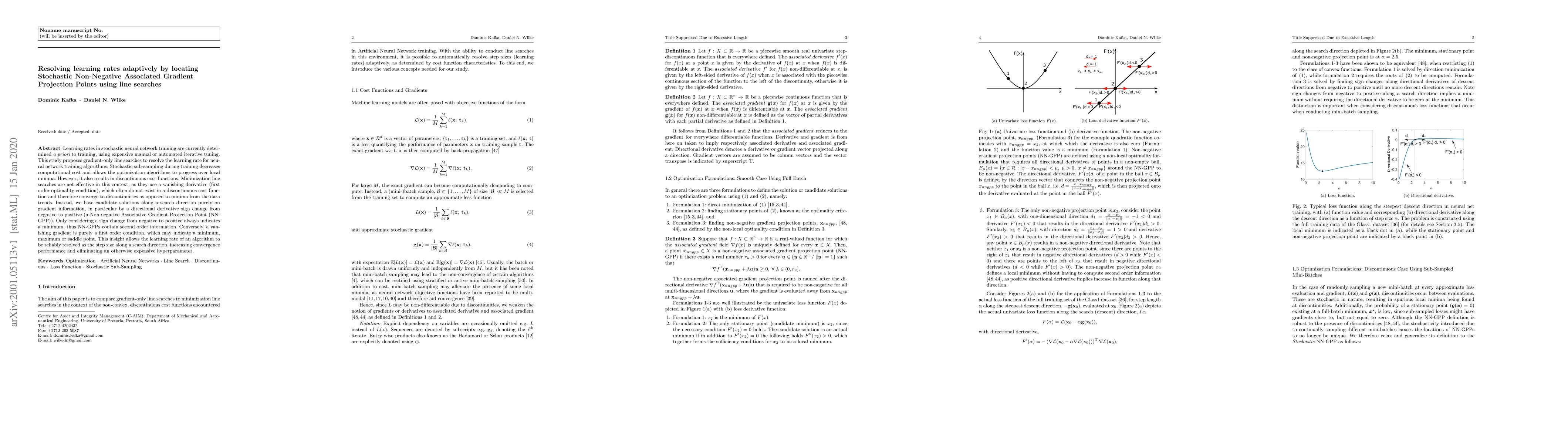 Learning rates in stochastic neural network training are currently determined a priori to training, using expensive manual or automated iterative tuning. This study proposes gradient-only line searches to resolve the learning rate for neural network training algorithms. Stochastic sub-sampling during training decreases computational cost and allows the optimization algorithms to progress over local minima. However, it also results in discontinuous cost functions. Minimization line searches are not effective in this context, as they use a vanishing derivative (first order optimality condition), which often do not exist in a discontinuous cost function and therefore converge to discontinuities as opposed to minima from the data trends. Instead, we base candidate solutions along a search direction purely on gradient information, in particular by a directional derivative sign change from negative to positive (a Non-negative Associative Gradient Projection Point (NN- GPP)). Only considering a sign change from negative to positive always indicates a minimum, thus NN-GPPs contain second order information. Conversely, a vanishing gradient is purely a first order condition, which may indicate a minimum, maximum or saddle point. This insight allows the learning rate of an algorithm to be reliably resolved as the step size along a search direction, increasing convergence performance and eliminating an otherwise expensive hyperparameter.