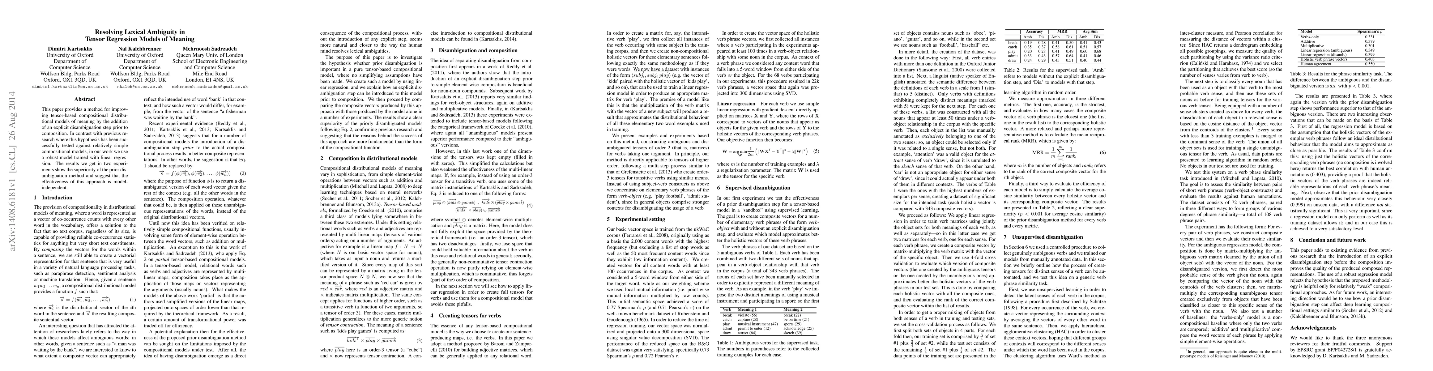 This paper proposes a method to enhance tensor-based compositional distributional models by incorporating an explicit disambiguation step before composition, demonstrating its effectiveness through linear regression models and showing superior results in two experiments. The findings suggest that this approach is effective across different models.