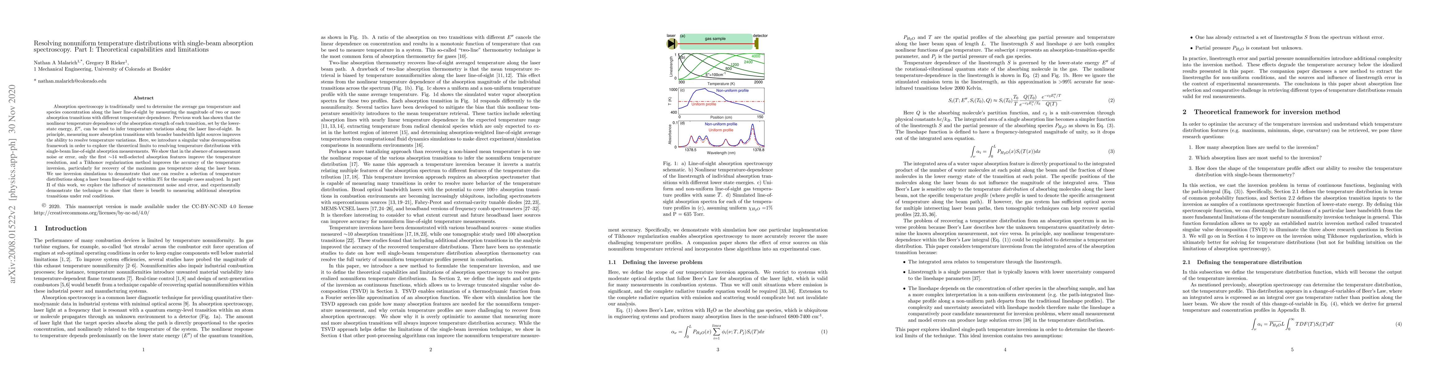 This paper introduces a singular value decomposition framework to explore the theoretical limits of resolving temperature distributions using single-beam absorption spectroscopy. It demonstrates that only the first ~14 well-selected absorption features can improve temperature resolution, and Tikhonov regularization enhances accuracy, particularly for the maximum temperature recovery.