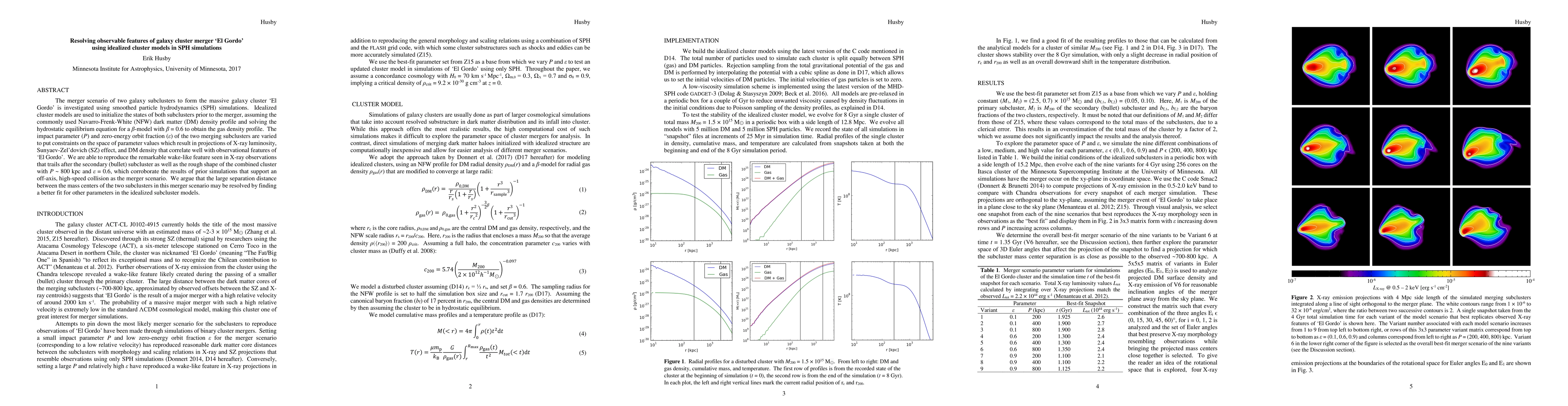 This paper investigates the merger of two galaxy subclusters forming the massive 'El Gordo' cluster using SPH simulations with idealized models. It finds that an off-axis, high-speed collision scenario best matches observational features, including a wake-like X-ray feature and the overall cluster shape.