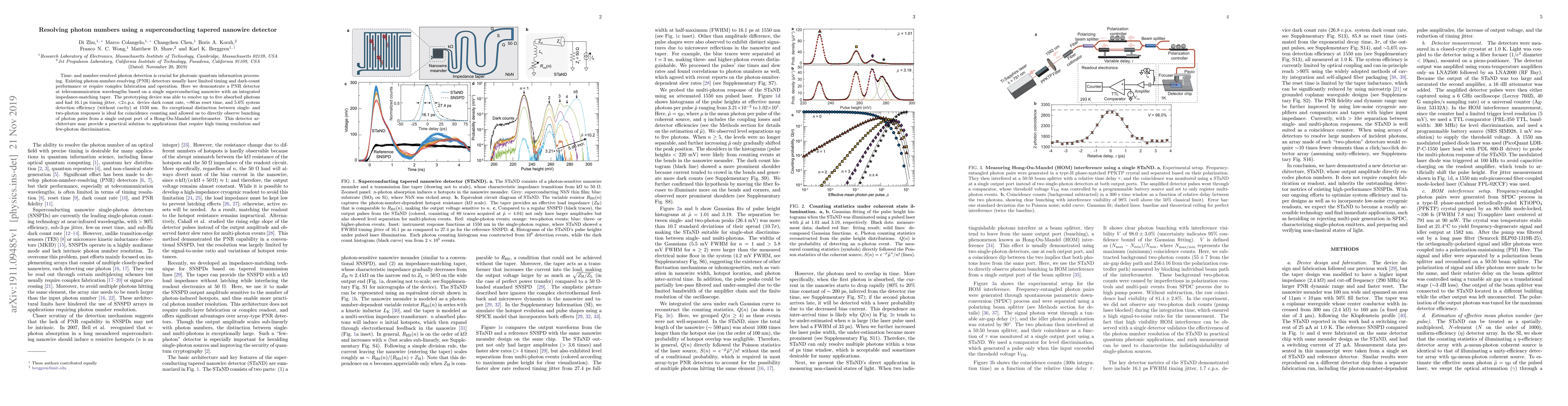 This paper presents a superconducting nanowire detector with a tapered design that achieves time- and number-resolved photon detection at telecommunication wavelengths, resolving up to five photons with minimal timing jitter and dark count rate, making it suitable for quantum information processing. The device's ability to distinguish single- and two-photon responses enables direct observation of photon pair bunching.