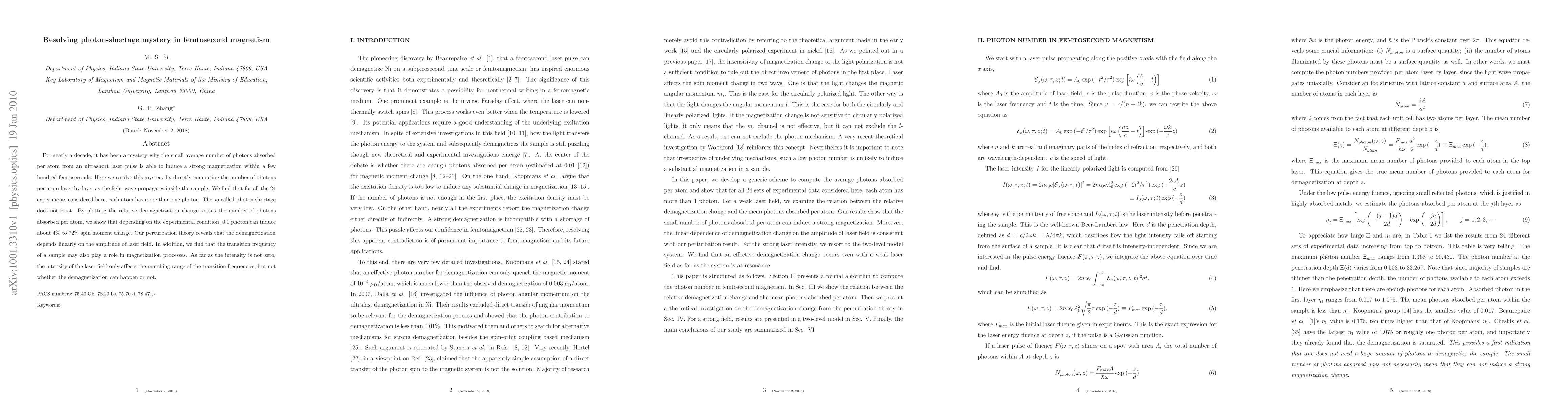For nearly a decade, it has been a mystery why the small average number of photons absorbed per atom from an ultrashort laser pulse is able to induce a strong magnetization within a few hundred femtoseconds. Here we resolve this mystery by directly computing the number of photons per atom layer by layer as the light wave propagates inside the sample. We find that for all the 24 experiments considered here, each atom has more than one photon. The so-called photon shortage does not exist. By plotting the relative demagnetization change versus the number of photons absorbed per atom, we show that depending on the experimental condition, 0.1 photon can induce about 4% to 72% spin moment change. Our perturbation theory reveals that the demagnetization depends linearly on the amplitude of laser field. In addition, we find that the transition frequency of a sample may also play a role in magnetization processes. As far as the intensity is not zero, the intensity of the laser field only affects the matching range of the transition frequencies, but not whether the demagnetization can happen or not.