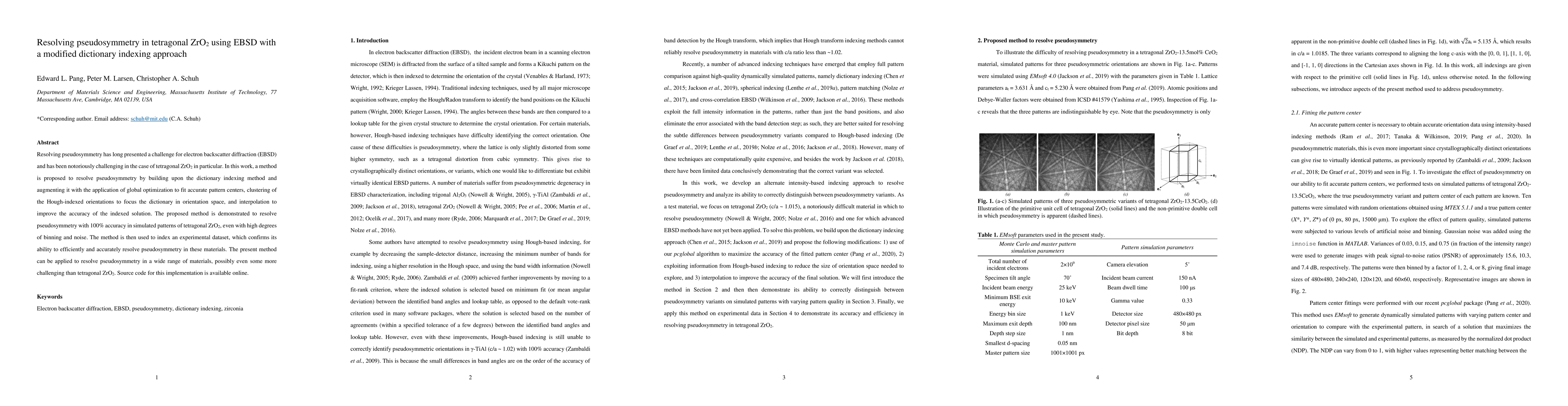 Resolving pseudosymmetry has long presented a challenge for electron backscatter diffraction (EBSD) and has been notoriously challenging in the case of tetragonal ZrO2 in particular. In this work, a method is proposed to resolve pseudosymmetry by building upon the dictionary indexing method and augmenting it with the application of global optimization to fit accurate pattern centers, clustering of the Hough-indexed orientations to focus the dictionary in orientation space, and interpolation to improve the accuracy of the indexed solution. The proposed method is demonstrated to resolve pseudosymmetry with 100% accuracy in simulated patterns of tetragonal ZrO2, even with high degrees of binning and noise. The method is then used to index an experimental dataset, which confirms its ability to efficiently and accurately resolve pseudosymmetry in these materials. The present method can be applied to resolve pseudosymmetry in a wide range of materials, possibly even some more challenging than tetragonal ZrO2. Source code for this implementation is available online.