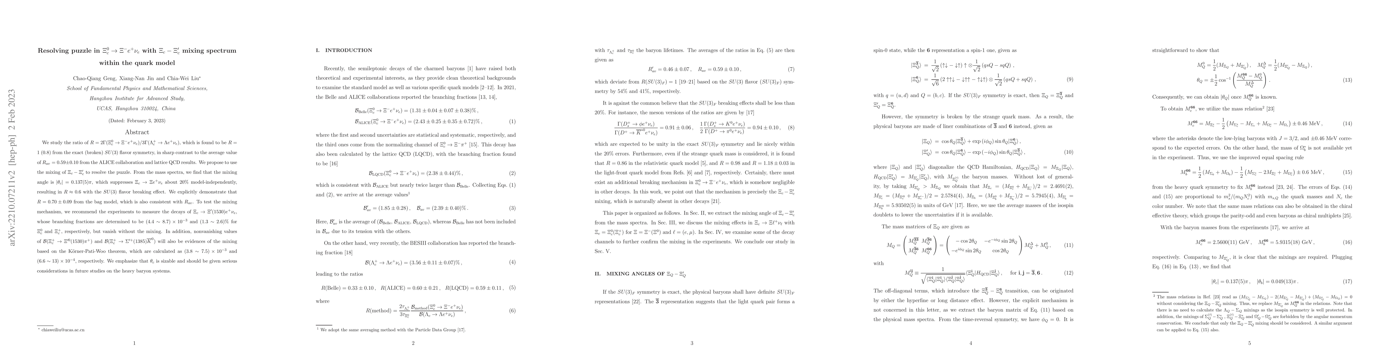 We study the ratio of $R=2 \Gamma(\Xi_c^0 \to \Xi^- e^+ \nu_e )/3\Gamma(\Lambda_c^+ \to \Lambda e^+ \nu_e )$, which is found to be $R= 1 (0.8)$ from the exact (broken) $SU(3)$ flavor symmetry, in sharp contrast to the average value of $R_{av}=0.59\pm 0.10 $ from the ALICE collaboration and lattice QCD results. We propose to use the mixing of $\Xi_c-\Xi_c'$ to resolve the puzzle. With the model-independent mass relations, we find that the mixing angle is $|\theta_c| = 0.137(5)\pi$, which suppresses $\Xi_c\to \Xi e^+ \nu_e$ about $20\%$ model-independently, resulting in $R\approx 0.6$ with the $SU(3)$ flavor breaking effect. We explicitly demonstrate that $R= 0.70 \pm 0.09$ from the bag model, which is also consistent with $R_{av}$. To test the mixing mechanism, we recommend the experiments to measure the decays of $\Xi_c \to \Xi '(1530) e^+ \nu_e$, whose branching fractions are determined to be $ ( 4.4\sim 8.7)\times 10^{-3}$ and $(1.3\sim 2.6 )\%$ for $\Xi_c^0$ and $\Xi_c^+$, respectively, but vanish without the mixing. In addition, nonvanishing values of ${\cal B}(\Xi_c^+\to \Xi^{\prime 0} (1530)\pi^+ )$ and ${\cal B}(\Xi_c^+\to \Sigma^{\prime +} (1530) \overline{K}^0 )$ will also be evidences of the mixing based on the K\"oner-Pati-Woo theorem, which are calculated as $(3.8\sim 7.5)\times 10^{-3}$ and $(6.6\sim 13)\times 10 ^{-4}$, respectively. We emphasize that $\theta_c$ is sizable and should be given serious considerations in future studies on the heavy baryon systems.
