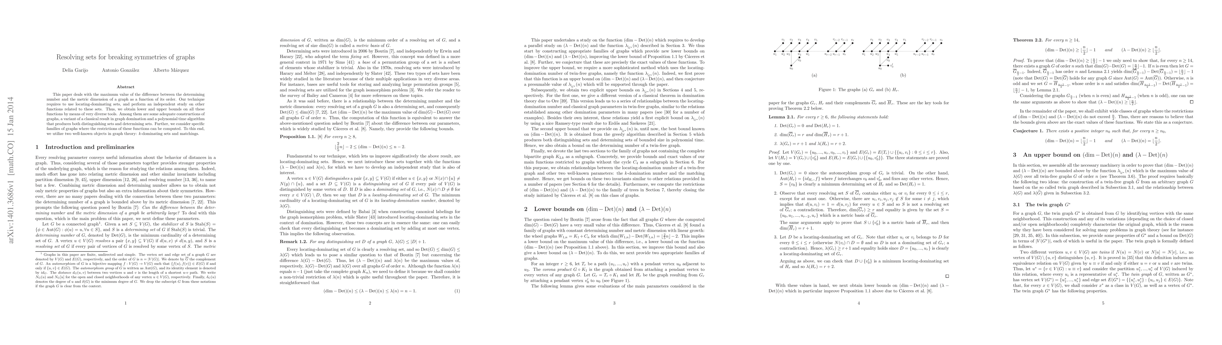 This paper deals with the maximum value of the difference between the determining number and the metric dimension of a graph as a function of its order. Our technique requires to use locating-dominating sets, and perform an independent study on other functions related to these sets. Thus, we obtain lower and upper bounds on all these functions by means of very diverse tools. Among them are some adequate constructions of graphs, a variant of a classical result in graph domination and a polynomial time algorithm that produces both distinguishing sets and determining sets. Further, we consider specific families of graphs where the restrictions of these functions can be computed. To this end, we utilize two well-known objects in graph theory: $k$-dominating sets and matchings.