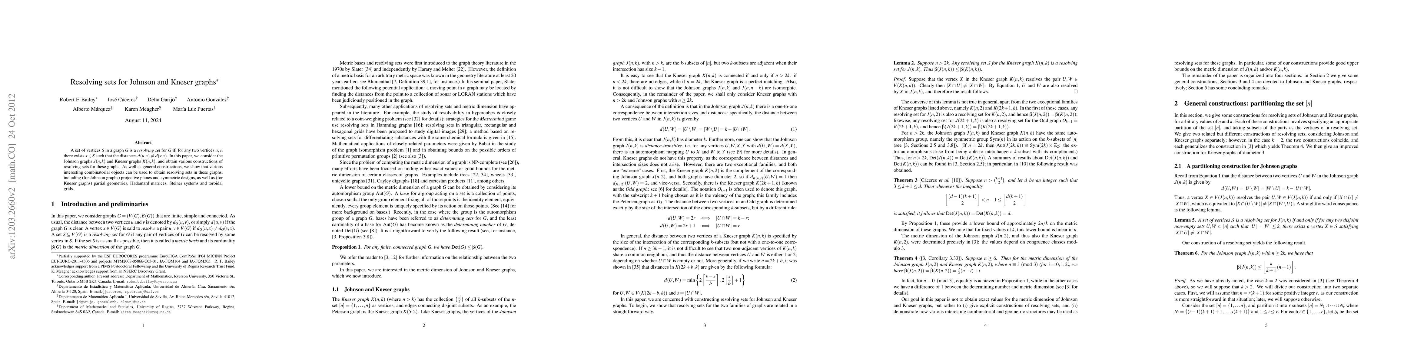 This paper constructs resolving sets for Johnson and Kneser graphs, utilizing combinatorial objects such as projective planes, symmetric designs, partial geometries, Hadamard matrices, Steiner systems, and toroidal grids to achieve these constructions.