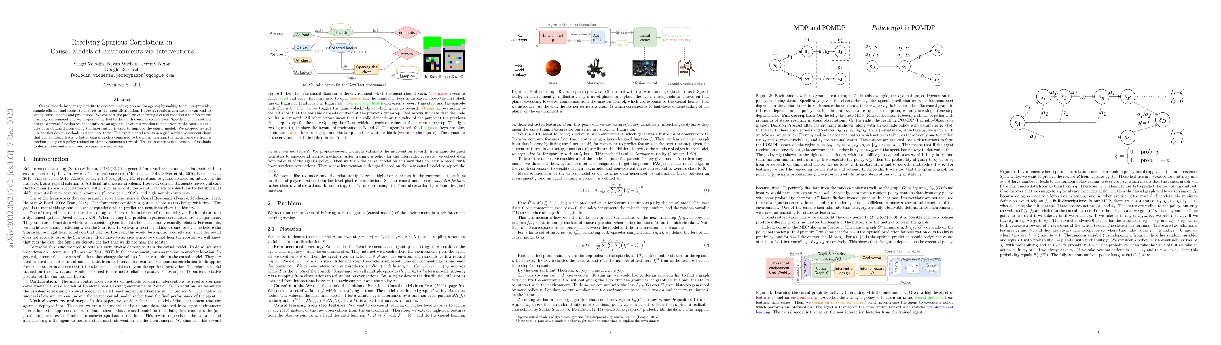Causal models bring many benefits to decision-making systems (or agents) by making them interpretable, sample-efficient, and robust to changes in the input distribution. However, spurious correlations can lead to wrong causal models and predictions. We consider the problem of inferring a causal model of a reinforcement learning environment and we propose a method to deal with spurious correlations. Specifically, our method designs a reward function that incentivizes an agent to do an intervention to find errors in the causal model. The data obtained from doing the intervention is used to improve the causal model. We propose several intervention design methods and compare them. The experimental results in a grid-world environment show that our approach leads to better causal models compared to baselines: learning the model on data from a random policy or a policy trained on the environment's reward. The main contribution consists of methods to design interventions to resolve spurious correlations.
