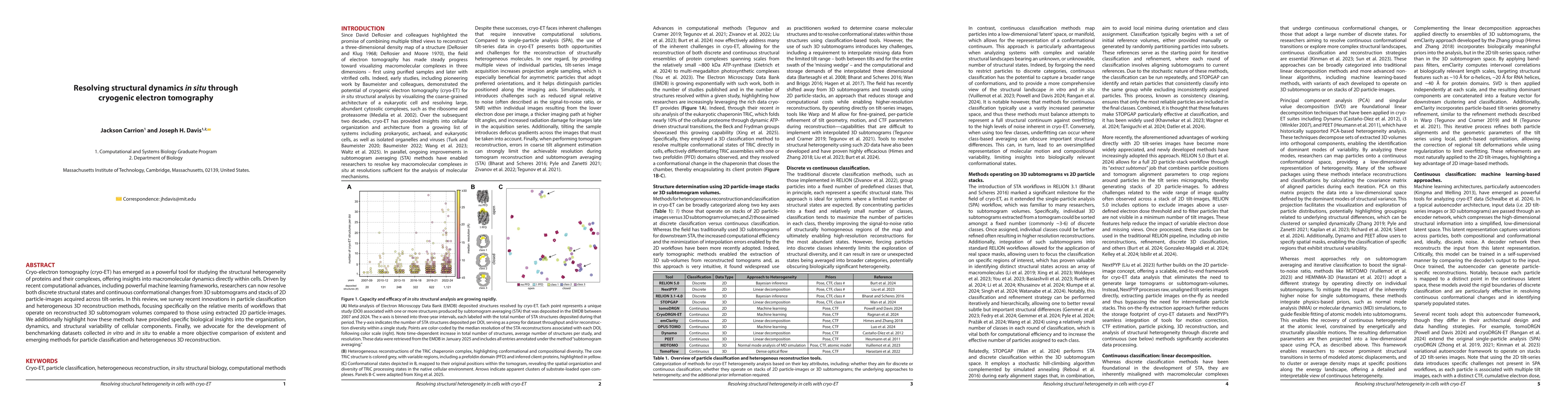 Cryo-electron tomography (cryo-ET) has emerged as a powerful tool for studying the structural heterogeneity of proteins and their complexes, offering insights into macromolecular dynamics directly within cells. Driven by recent computational advances, including powerful machine learning frameworks, researchers can now resolve both discrete structural states and continuous conformational changes from 3D subtomograms and stacks of 2D particle-images acquired across tilt-series. In this review, we survey recent innovations in particle classification and heterogeneous 3D reconstruction methods, focusing specifically on the relative merits of workflows that operate on reconstructed 3D subtomogram volumes compared to those using extracted 2D particle-images. We additionally highlight how these methods have provided specific biological insights into the organization, dynamics, and structural variability of cellular components. Finally, we advocate for the development of benchmarking datasets collected in vitro and in situ to enable a more objective comparison of existent and emerging methods for particle classification and heterogeneous 3D reconstruction.