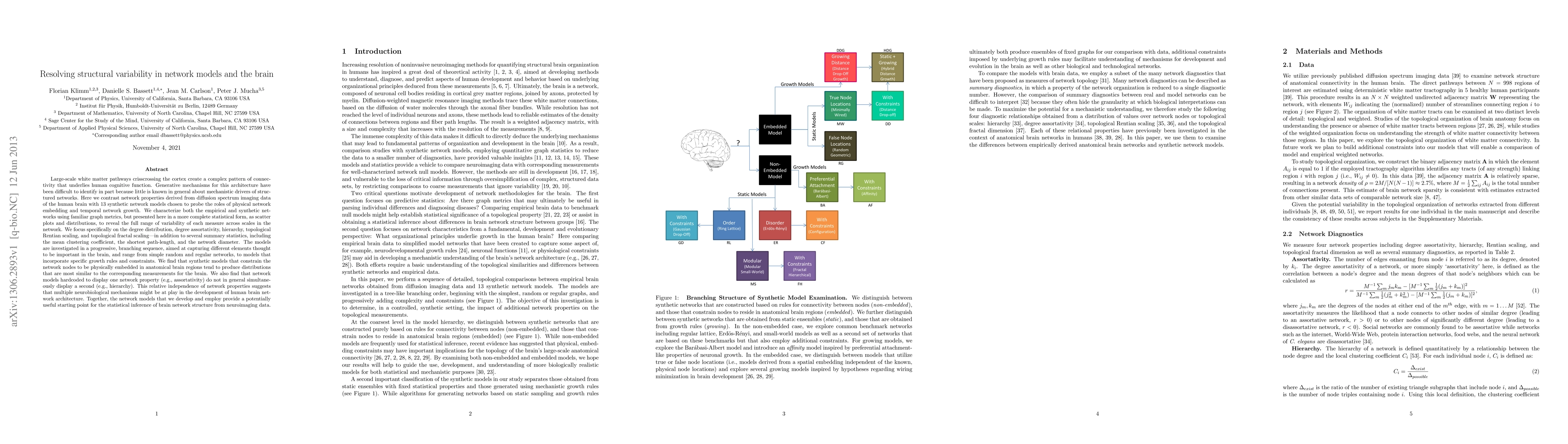 Large-scale white matter pathways crisscrossing the cortex create a complex pattern of connectivity that underlies human cognitive function. Generative mechanisms for this architecture have been difficult to identify in part because little is known about mechanistic drivers of structured networks. Here we contrast network properties derived from diffusion spectrum imaging data of the human brain with 13 synthetic network models chosen to probe the roles of physical network embedding and temporal network growth. We characterize both the empirical and synthetic networks using familiar diagnostics presented in statistical form, as scatter plots and distributions, to reveal the full range of variability of each measure across scales in the network. We focus on the degree distribution, degree assortativity, hierarchy, topological Rentian scaling, and topological fractal scaling---in addition to several summary statistics, including the mean clustering coefficient, shortest path length, and network diameter. The models are investigated in a progressive, branching sequence, aimed at capturing different elements thought to be important in the brain, and range from simple random and regular networks, to models that incorporate specific growth rules and constraints. We find that synthetic models that constrain the network nodes to be embedded in anatomical brain regions tend to produce distributions that are similar to those extracted from the brain. We also find that network models hardcoded to display one network property do not in general also display a second, suggesting that multiple neurobiological mechanisms might be at play in the development of human brain network architecture. Together, the network models that we develop and employ provide a potentially useful starting point for the statistical inference of brain network structure from neuroimaging data.