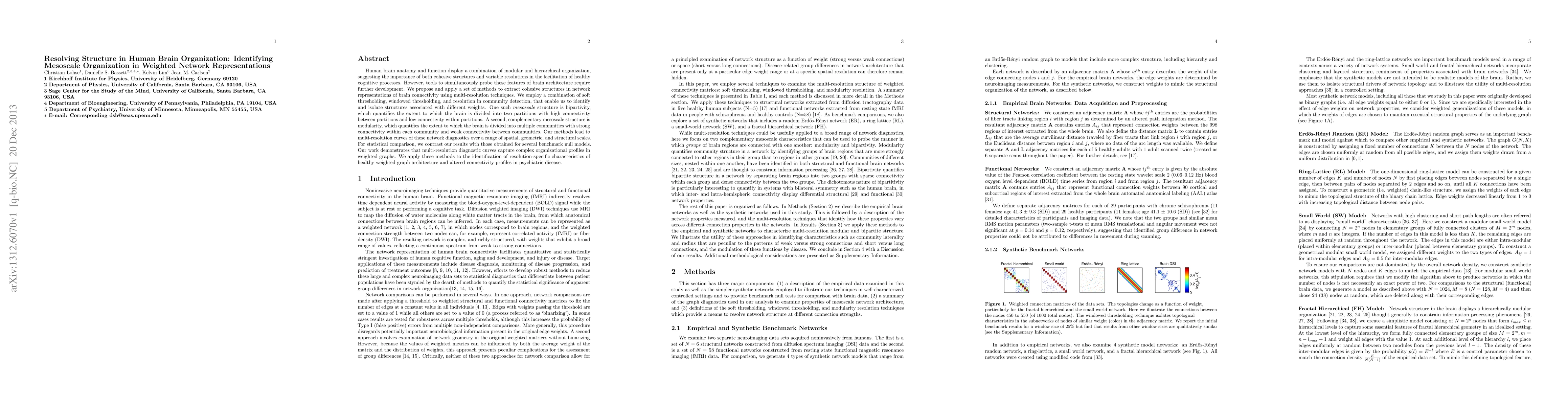 Human brain anatomy and function display a combination of modular and hierarchical organization, suggesting the importance of both cohesive structures and variable resolutions in the facilitation of healthy cognitive processes. However, tools to simultaneously probe these features of brain architecture require further development. We propose and apply a set of methods to extract cohesive structures in network representations of brain connectivity using multi-resolution techniques. We employ a combination of soft thresholding, windowed thresholding, and resolution in community detection, that enable us to identify and isolate structures associated with different weights. One such mesoscale structure is bipartivity, which quantifies the extent to which the brain is divided into two partitions with high connectivity between partitions and low connectivity within partitions. A second, complementary mesoscale structure is modularity, which quantifies the extent to which the brain is divided into multiple communities with strong connectivity within each community and weak connectivity between communities. Our methods lead to multi-resolution curves of these network diagnostics over a range of spatial, geometric, and structural scales. For statistical comparison, we contrast our results with those obtained for several benchmark null models. Our work demonstrates that multi-resolution diagnostic curves capture complex organizational profiles in weighted graphs. We apply these methods to the identification of resolution-specific characteristics of healthy weighted graph architecture and altered connectivity profiles in psychiatric disease.