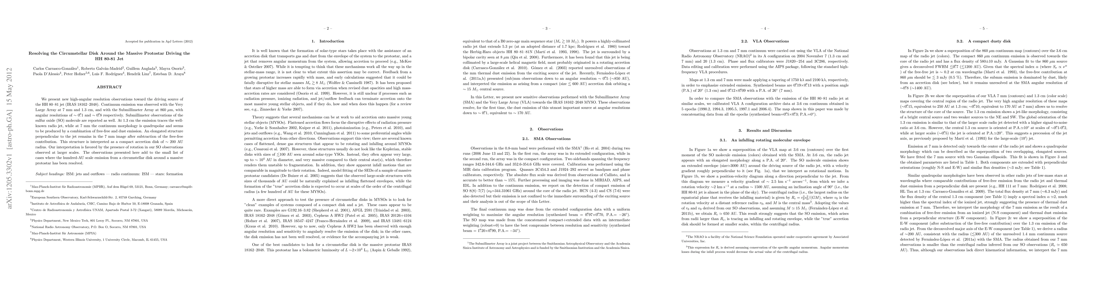 This study uses high-angular resolution observations to resolve the circumstellar disk around the massive protostar IRAS 18162-2048, which drives the HH 80-81 jet. The findings suggest the presence of a compact accretion disk of approximately 200 AU radius, inferred from the quadrupolar continuum morphology at 7 mm and rotation in sulfur oxide observations.