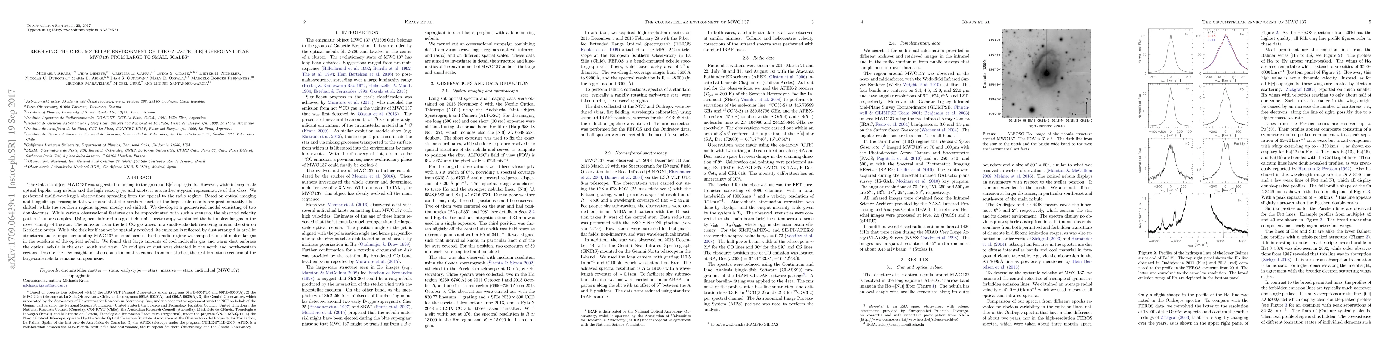 The Galactic object MWC 137 was suggested to belong to the group of B[e] supergiants. However, with its large-scale optical bipolar ring nebula and the high velocity jet and knots, it is a rather atypical representative of this class. We performed multi-wavelength observations spreading from the optical to the radio regime. Based on optical imaging and long-slit spectroscopic data we found that the northern parts of the large-scale nebula are predominantly blue-shifted, while the southern regions appear mostly red-shifted. We developed a geometrical model consisting of two double-cones. While various observational features can be approximated with such a scenario, the observed velocity pattern is more complex. Using near-infrared integral-field unit spectroscopy we studied the hot molecular gas in the close vicinity of the star. The emission from the hot CO gas arises in a small-scale disk revolving around the star on Keplerian orbits. While the disk itself cannot be spatially resolved, its emission is reflected by dust arranged in arc-like structures and clumps surrounding MWC 137 on small scales. In the radio regime we mapped the cold molecular gas in the outskirts of the optical nebula. We found that large amounts of cool molecular gas and warm dust embrace the optical nebula in the east, south and west. No cold gas or dust were detected in the north and north-western regions. Despite the new insights on the nebula kinematics gained from our studies, the real formation scenario of the large-scale nebula remains an open issue.