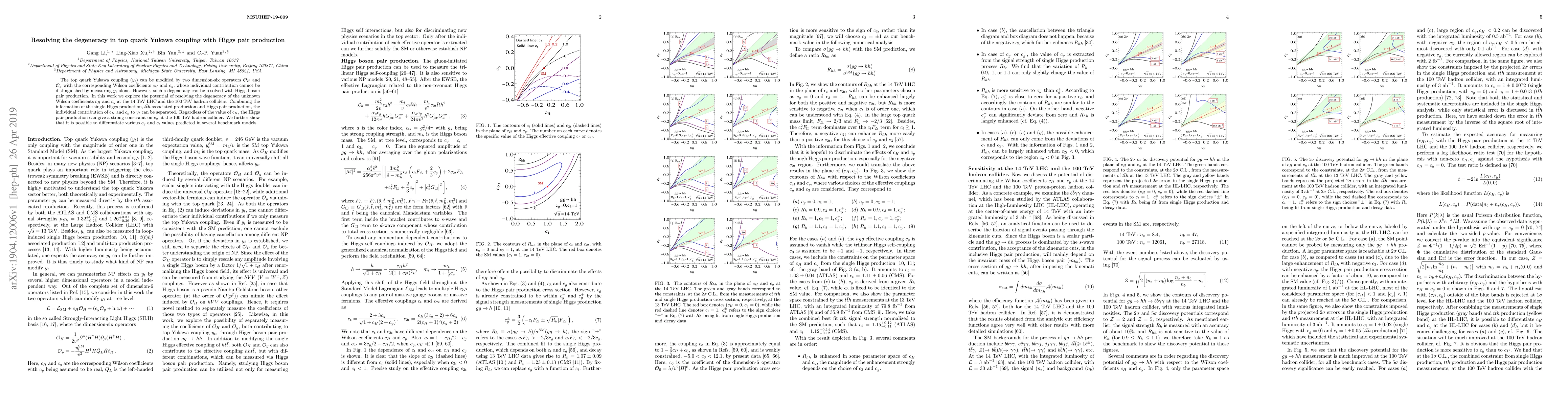This paper investigates the potential to resolve the degeneracy in the top quark Yukawa coupling ($y_t$) through Higgs pair production at the 14 TeV LHC and 100 TeV hadron colliders. By combining data from single Higgs, $t\bar{t}h$, and Higgs pair production, it demonstrates the ability to distinguish the contributions of Wilson coefficients $c_H$ and $c_y$.