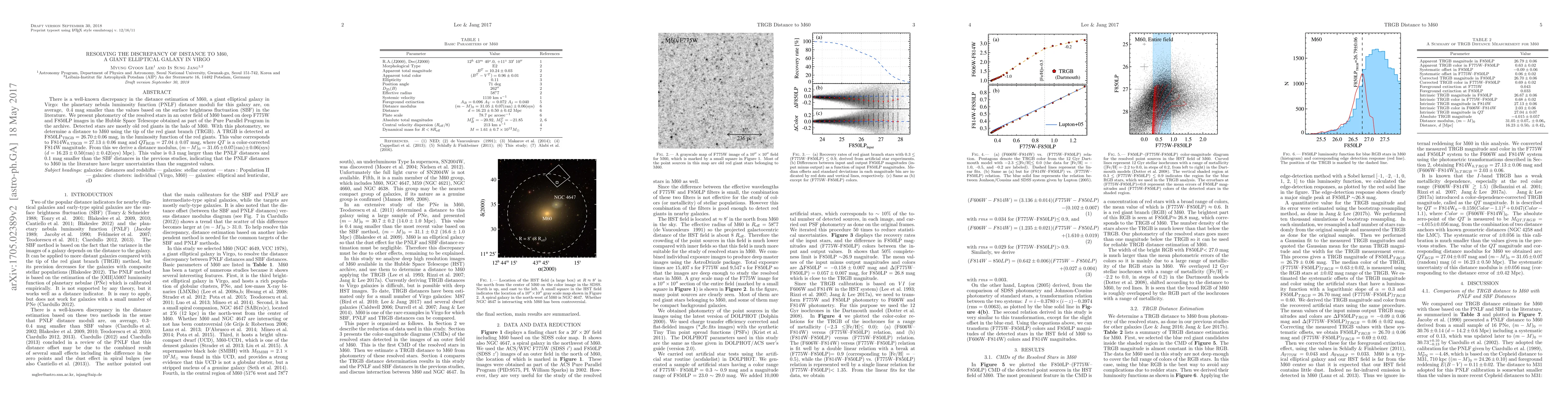 There is a well-known discrepancy in the distance estimation for M60, a giant elliptical galaxy in Virgo: the planetary nebula luminosity function (PNLF) distance moduli for this galaxy are, on average, $~0.4$ mag smaller than the values based on the surface brightness fluctuation (SBF) in the literature. We present photometry of the resolved stars in an outer field of M60 based on deep F775W and F850LP images in the Hubble Space Telescope obtained as part of the Pure Parallel Program in the archive. Detected stars are mostly old red giants in the halo of M60. With this photometry we determine a distance to M60 using the tip of the red giant branch (TRGB). A TRGB is detected at $F850LP_{\rm TRGB}=26.70\pm0.06$ mag, in the luminosity function of the red giants. This value corresponds to $F814W_{0,\rm TRGB}=27.13\pm0.06$ mag and $QT_{\rm TRGB}=27.04\pm0.07$ mag, where $QT$ is a color-corrected F814W magnitude. From this we derive a distance modulus, $(m-M)_0=31.05\pm0.07{\rm(ran)}\pm0.06{\rm (sys)}$ ($d=16.23\pm0.50{\rm (ran)}\pm0.42{\rm (sys)}$ Mpc). This value is $0.3$ mag larger than the PNLF distances and $0.1$ mag smaller than the SBF distances in the previous studies, indicating that the PNLF distances to M60 in the literature have larger uncertainties than the suggested values.