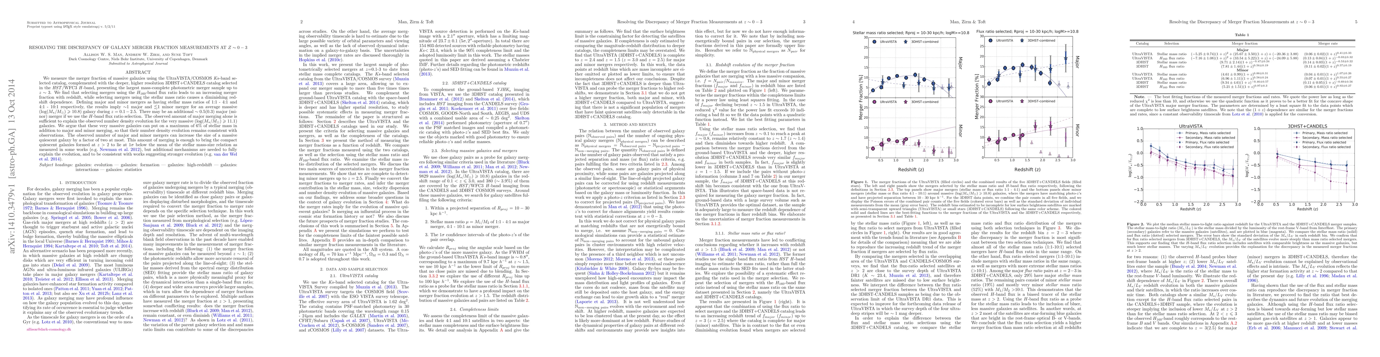 We measure the merger fraction of massive galaxies using the UltraVISTA/COSMOS $Ks$-band selected catalog, complemented with the deeper, higher resolution 3DHST+CANDELS catalog selected in the HST/WFC3 $H$-band, presenting the largest mass-complete photometric merger sample up to $z\sim3$. We find that selecting mergers using the $H_{160}$-band flux ratio leads to an increasing merger fraction with redshift, while selecting mergers using the stellar mass ratio causes a diminishing redshift dependence. Defining major and minor mergers as having stellar mass ratios of 1:1 - 4:1 and 4:1 - 10:1 respectively, the results imply $\sim$1 major and $\lesssim$1 minor merger for an average massive (log$(M_{\star}/M_{\odot}) \geqslant 10.8$) galaxy during $z=0.1-2.5$. There may be an additional $\sim 0.5(0.3)$ major (minor) merger if we use the $H$-band flux ratio selection. The observed amount of major merging alone is sufficient to explain the observed number density evolution for the very massive (log$(M_{\star}/M_{\odot}) \geqslant 11.1$) galaxies. We argue that these very massive galaxies can put on a maximum of $6\%$ of stellar mass in addition to major and minor merging, so that their number density evolution remains consistent with observations. The observed number of major and minor mergers can increase the size of a massive quiescent galaxy by a factor of two at most. This amount of merging is enough to bring the compact quiescent galaxies formed at $z>2$ to lie at $1\sigma$ below the mean of the stellar mass-size relation as measured in some works (e.g. Newman et al. 2012), but additional mechanisms are needed to fully explain the evolution, and to be consistent with works suggesting stronger evolution (e.g. van der Wel et al. 2014).