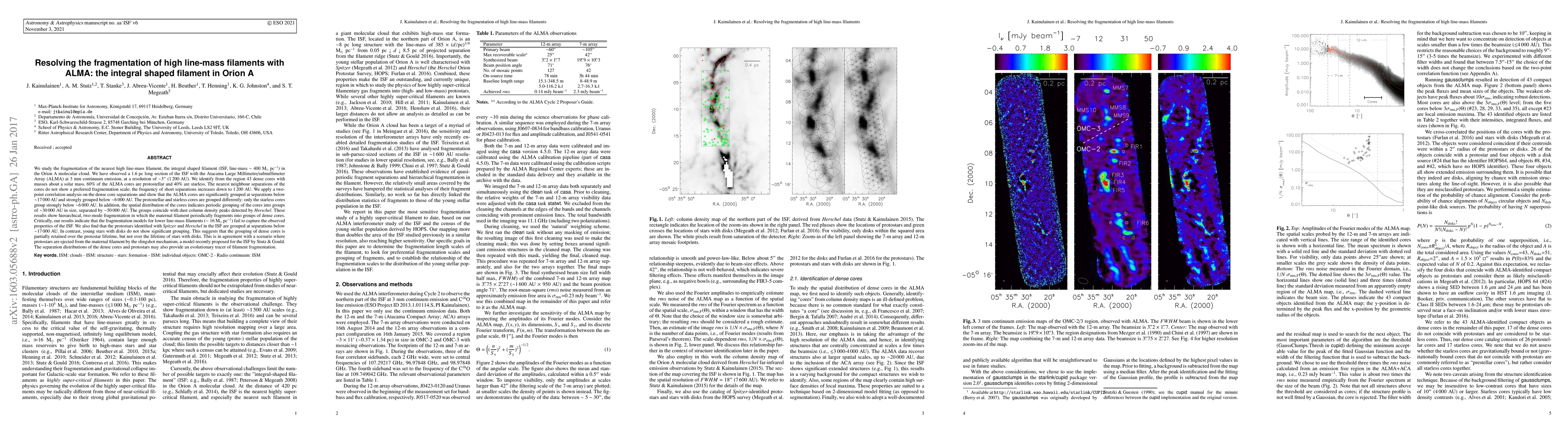 We study the fragmentation of the nearest high line-mass filament, the integral shaped filament (ISF, line-mass $\sim$ 400 M$_\odot$ pc$^{-1}$) in the Orion A molecular cloud. We have observed a 1.6 pc long section of the ISF with the Atacama Large Millimetre/submillimeter Array (ALMA) at 3 mm continuum emission, at a resolution of $\sim$3" (1 200 AU). We identify from the region 43 dense cores with masses about a solar mass. 60% of the ALMA cores are protostellar and 40\% are starless. The nearest neighbour separations of the cores do not show a preferred fragmentation scale; the frequency of short separations increases down to 1 200 AU. We apply a two-point correlation analysis on the dense core separations and show that the ALMA cores are significantly grouped at separations below $\sim$17 000 AU and strongly grouped below $\sim$6 000 AU. The protostellar and starless cores are grouped differently: only the starless cores group strongly below $\sim$6 000 AU. In addition, the spatial distribution of the cores indicates periodic grouping of the cores into groups of $\sim$30 000 AU in size, separated by $\sim$50 000 AU. The groups coincide with dust column density peaks detected by Herschel. These results show hierarchical, two-mode fragmentation in which the maternal filament periodically fragments into groups of dense cores. Critically, our results indicate that the fragmentation models for lower line-mass filaments ($\sim$ 16 M$_\odot$ pc$^{-1}$) fail to capture the observed properties of the ISF. We also find that the protostars identified with Spitzer and Herschel in the ISF are grouped at separations below $\sim$17 000 AU. In contrast, young stars with disks do not show significant grouping. This suggests that the grouping of dense cores is partially retained over the protostar lifetime, but not over the lifetime of stars with disks.