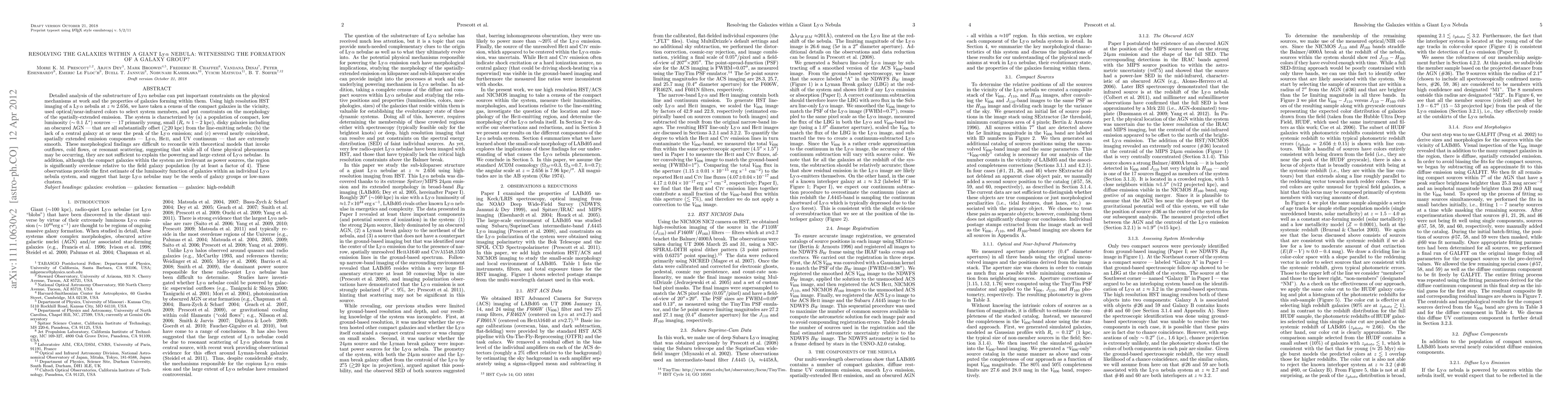 Detailed analysis of the substructure of Lya nebulae can put important constraints on the physical mechanisms at work and the properties of galaxies forming within them. Using high resolution HST imaging of a Lya nebula at z~2.656, we have taken a census of the compact galaxies in the vicinity, used optical/near-infrared colors to select system members, and put constraints on the morphology of the spatially-extended emission. The system is characterized by (a) a population of compact, low luminosity (~0.1 L*) sources --- 17 primarily young, small (Re~1-2 kpc), disky galaxies including an obscured AGN --- that are all substantially offset (>20 kpc) from the line-emitting nebula; (b) the lack of a central galaxy at or near the peak of the Lya emission; and (c) several nearly coincident, spatially extended emission components --- Lya, HeII, and UV continuum --- that are extremely smooth. These morphological findings are difficult to reconcile with theoretical models that invoke outflows, cold flows, or resonant scattering, suggesting that while all of these physical phenomena may be occurring, they are not sufficient to explain the powering and large extent of Lya nebulae. In addition, although the compact galaxies within the system are irrelevant as power sources, the region is significantly overdense relative to the field galaxy population (by at least a factor of 4). These observations provide the first estimate of the luminosity function of galaxies within an individual Lya nebula system, and suggest that large Lya nebulae may be the seeds of galaxy groups or low-mass clusters.