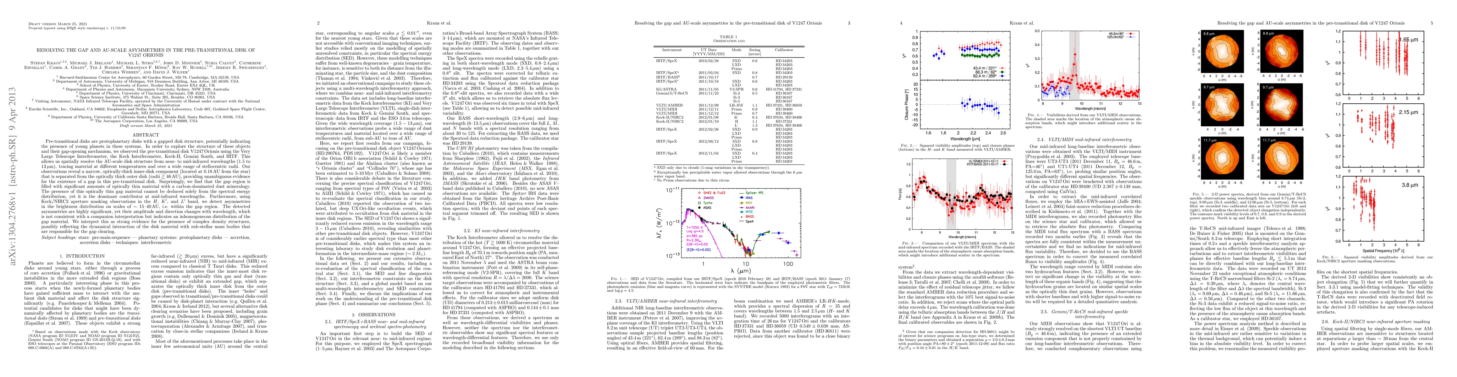 Astronomers observed V1247 Orionis with multiple telescopes to study its pre-transitional disk, revealing a narrow inner-disk component separated from an outer disk, indicating a gap in the disk structure. The gap is filled with optically thin material, and asymmetries were detected within this region.