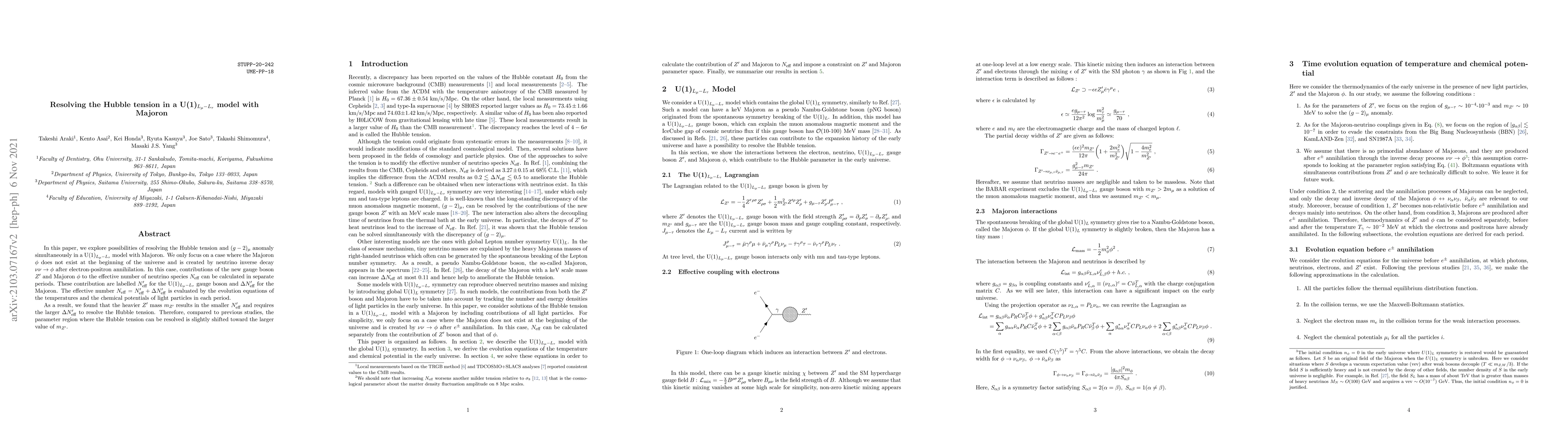 This paper investigates a U(1)$_{L_\mu-L_\tau}$ model with Majoron to resolve the Hubble tension and the $(g-2)_{\mu}$ anomaly. It finds that heavier $Z^\prime$ masses require larger Majoron contributions to reconcile the Hubble tension, shifting the parameter region slightly towards larger $m_{Z^\prime}$.