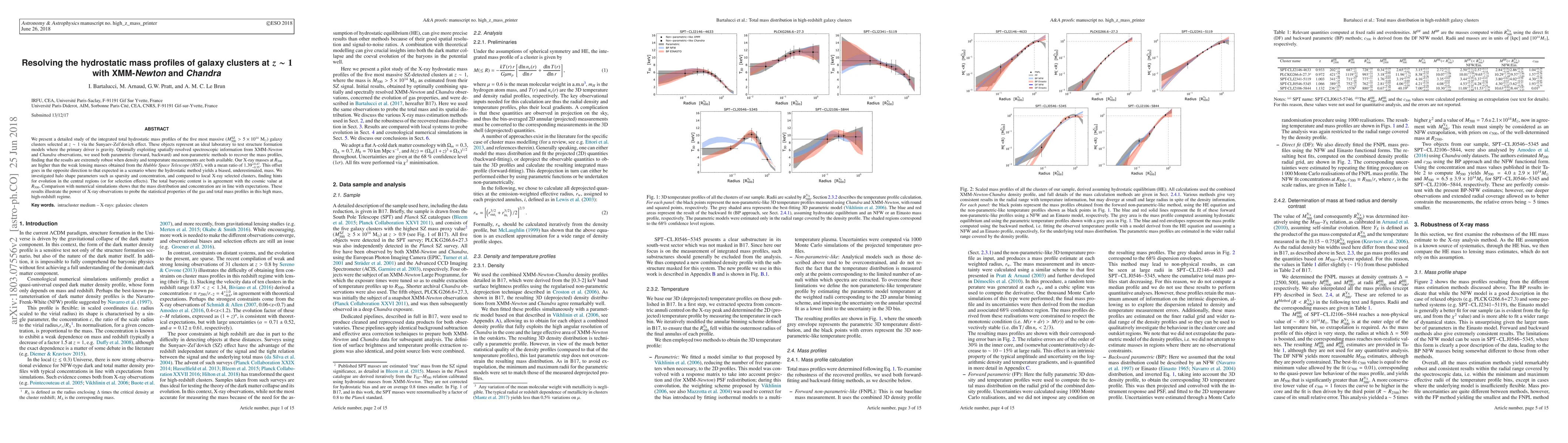 We present a detailed study of the integrated total hydrostatic mass profiles of the five most massive ($M^{\mathrm{SZ}}_{500} > 5 \times 10^{14}$ M$_{\odot}$) galaxy clusters selected at $z\sim1$ via the Sunyaev-Zel'dovich effect. These objects represent an ideal laboratory to test structure formation models where the primary driver is gravity. Optimally exploiting spatially-resolved spectroscopic information from XMM-Newton and Chandra observations, we used both parametric (forward, backward) and non-parametric methods to recover the mass profiles, finding that the results are extremely robust when density and temperature measurements are both available. Our X-ray masses at $R_{500}$ are higher than the weak lensing masses obtained from the Hubble Space Telescope (HST), with a mean ratio of $1.39^{+0.47}_{-0.35}$. This offset goes in the opposite direction to that expected in a scenario where the hydrostatic method yields a biased, underestimated, mass. We investigated halo shape parameters such as sparsity and concentration, and compared to local X-ray selected clusters, finding hints for evolution in the central regions (or for selection effects). The total baryonic content is in agreement with the cosmic value at $R_{500}$. Comparison with numerical simulations shows that the mass distribution and concentration are in line with expectations. These results illustrate the power of X-ray observations to probe the statistical properties of the gas and total mass profiles in this high-mass, high-redshift regime.