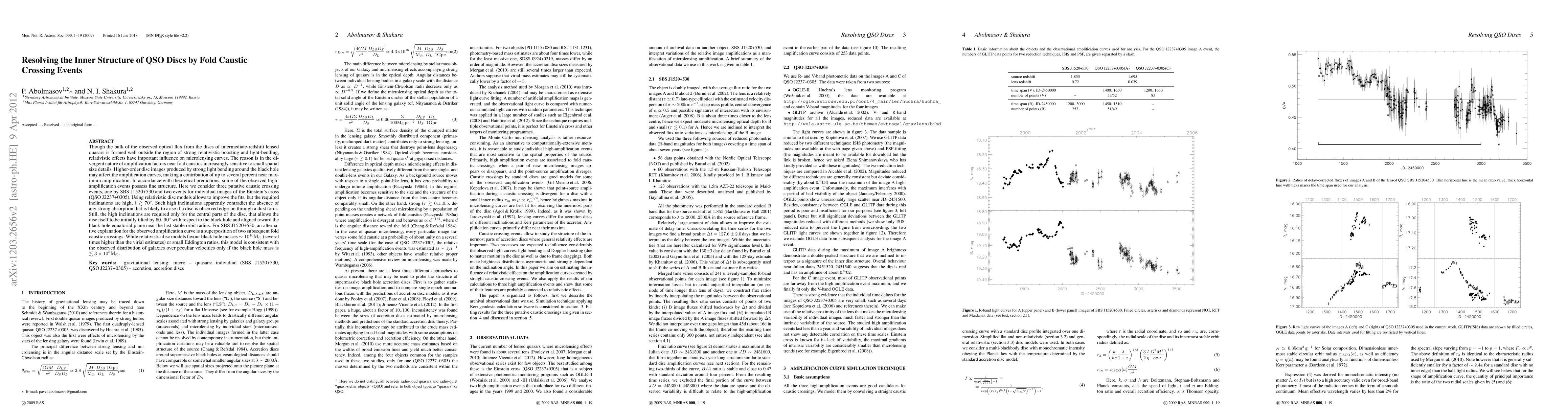 Though the bulk of the observed optical flux from the discs of intermediate-redshift lensed quasars is formed well outside the region of strong relativistic boosting and light-bending, relativistic effects have important influence on microlensing curves. The reason is in the divergent nature of amplification factors near fold caustics increasingly sensitive to small spatial size details. Higher-order disc images produced by strong light bending around the black hole may affect the amplification curves, making a contribution of up to several percent near maximum amplification. In accordance with theoretical predictions, some of the observed high-amplification events possess fine structure. Here we consider three putative caustic crossing events, one by SBS1520+530 and two events for individual images of the Einstein's cross (QSO J2237+0305). Using relativistic disc models allows to improve the fits, but the required inclinations are high, about 70deg or larger. Such high inclinations apparently contradict the absence of any strong absorption that is likely to arise if a disc is observed edge-on through a dust torus. Still, the high inclinations are required only for the central parts of the disc, that allows the disc itself to be initially tilted by 60-90deg with respect to the black hole and aligned toward the black hole equatorial plane near the last stable orbit radius. For SBS1520+530, an alternative explanation for the observed amplification curve is a superposition of two subsequent fold caustic crossings. While relativistic disc models favour black hole masses ~10^10 solar (several times higher than the virial estimates) or small Eddington ratios, this model is consistent with the observed distribution of galaxies over peculiar velocities only if the black hole mass is about 3 10^8 solar.