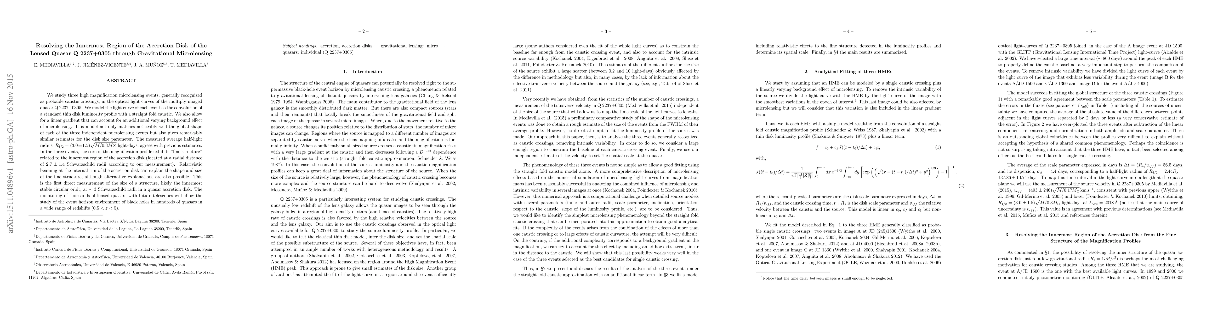 This study resolves the innermost region of the accretion disk of the lensed quasar Q 2237+0305 through gravitational microlensing, revealing a structure at approximately 3 Schwarzschild radii. The analysis of microlensing events provides a direct measurement of the accretion disk's size, supporting relativistic beaming as a plausible explanation for the observed fine structure.