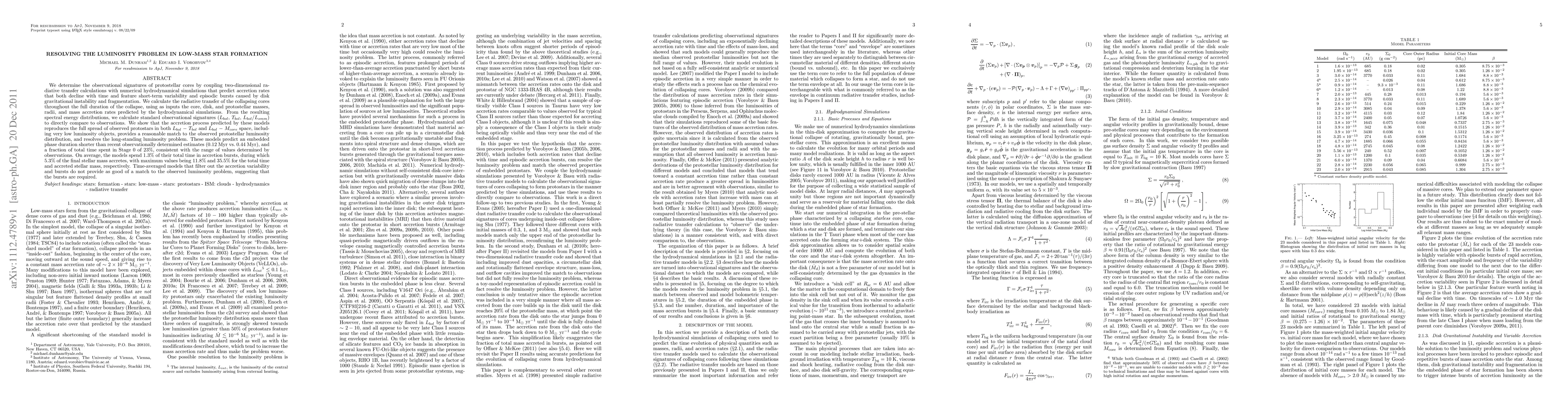 This study uses two-dimensional radiative transfer calculations and hydrodynamical simulations to model protostellar cores. The findings suggest that accretion rates declining over time, along with short-term variability and episodic bursts, can explain the luminosity distribution of low-mass protostars, addressing the 'luminosity problem'. The model predicts a shorter embedded phase duration and a higher fraction of time in Stage 0 of protostellar evolution compared to previous estimates. It also highlights the significance of accretion bursts in matching observed luminosity distributions.