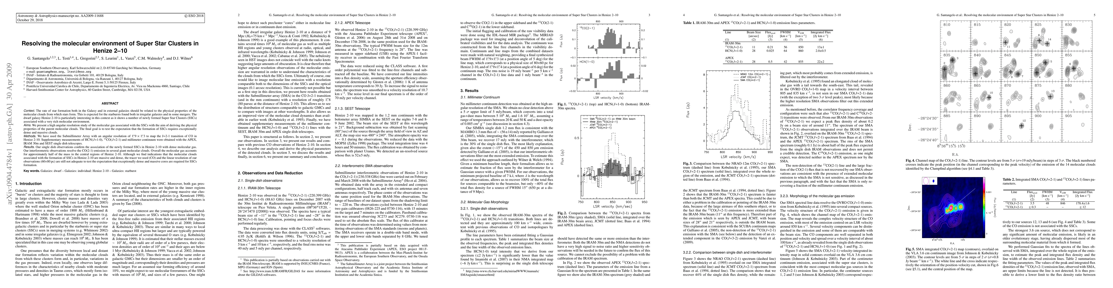 The rate of star formation both in the Galaxy and in external galaxies should be related to the physical properties of the molecular clouds from which stars form. This is expected for the starbursts found both in irregular galaxies and in some mergers. The dwarf galaxy Henize 2-10 is particularly interesting in this context as it shows a number of newly formed Super Star Clusters (SSCs) associated with a very rich molecular environment. We present a high angular resolution study of the molecular gas associated with the SSCs with the aim of deriving the physical properties of the parent molecular clouds. The final goal is to test the expectation that the formation of SSCs requires exceptionally dense and massive clouds. We have used the Submillimeter Array with an angular resolution of 1.9 X 1.3 to map the J=2-1 transition of CO in Henize 2-10. Supplementary measurements of HCN(J=1-0), 13CO(J=2-1) and millimeter continuum were obtained with the APEX, IRAM-30m and SEST single dish telescopes. Our single dish observations confirm the association of the newly formed SSCs in Henize 2-10 with dense molecular gas. Our interferometric observations resolve the CO(2-1) emission in several giant molecular clouds. Overall the molecular gas accounts for approximately half of the mass in the central regions of Henize 2-10. Although we find indications that the molecular clouds associated with the formation of SSCs in Henize 2-10 are massive and dense, the tracer we used (CO) and the linear resolution of our observations (60 X 80 pc) are still not adequate to test the expectation that exceptionally dense and massive cores are required for SSCs formation.