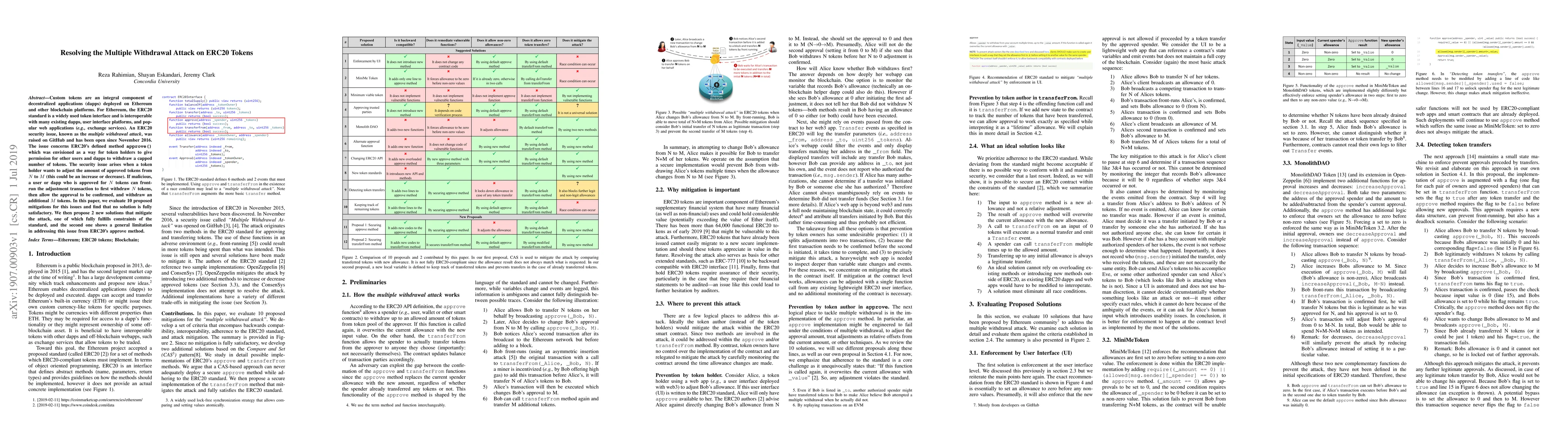 Custom tokens are an integral component of decentralized applications (dapps) deployed on Ethereum and other blockchain platforms. For Ethereum, the ERC20 standard is a widely used token interface and is interoperable with many existing dapps, user interface platforms, and popular web applications (e.g., exchange services). An ERC20 security issue, known as the "multiple withdrawal attack", was raised on GitHub and has been open since November 2016. The issue concerns ERC20's defined method approve() which was envisioned as a way for token holders to give permission for other users and dapps to withdraw a capped number of tokens. The security issue arises when a token holder wants to adjust the amount of approved tokens from N to M (this could be an increase or decrease). If malicious, a user or dapp who is approved for N tokens can front-run the adjustment transaction to first withdraw N tokens, then allow the approval to be confirmed, and withdraw an additional M tokens. In this paper, we evaluate 10 proposed mitigations for this issues and find that no solution is fully satisfactory. We then propose 2 new solutions that mitigate the attack, one of which fully fulfills constraints of the standard, and the second one shows a general limitation in addressing this issue from ERC20's approve method.
