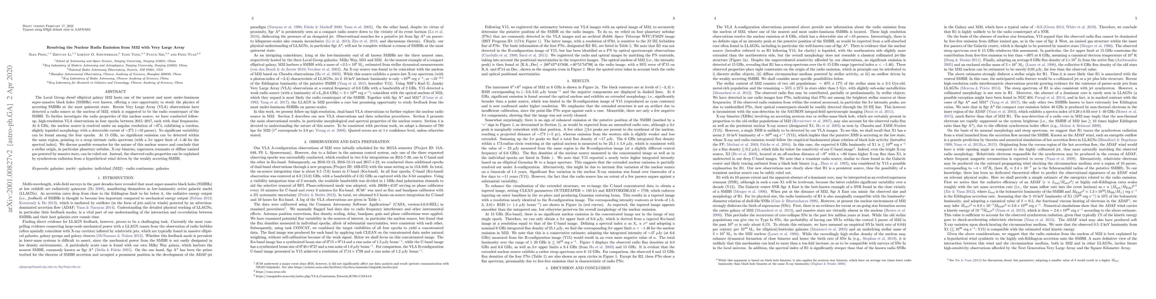 The VLA observations of M32's radio nucleus reveal a coreless, slightly lopsided source at 6 GHz, with no significant variability over four epochs, suggesting synchrotron radiation from a wind driven by the weakly accreting supermassive black hole. No emission is detected at 15 GHz, indicating a steep radio spectrum.