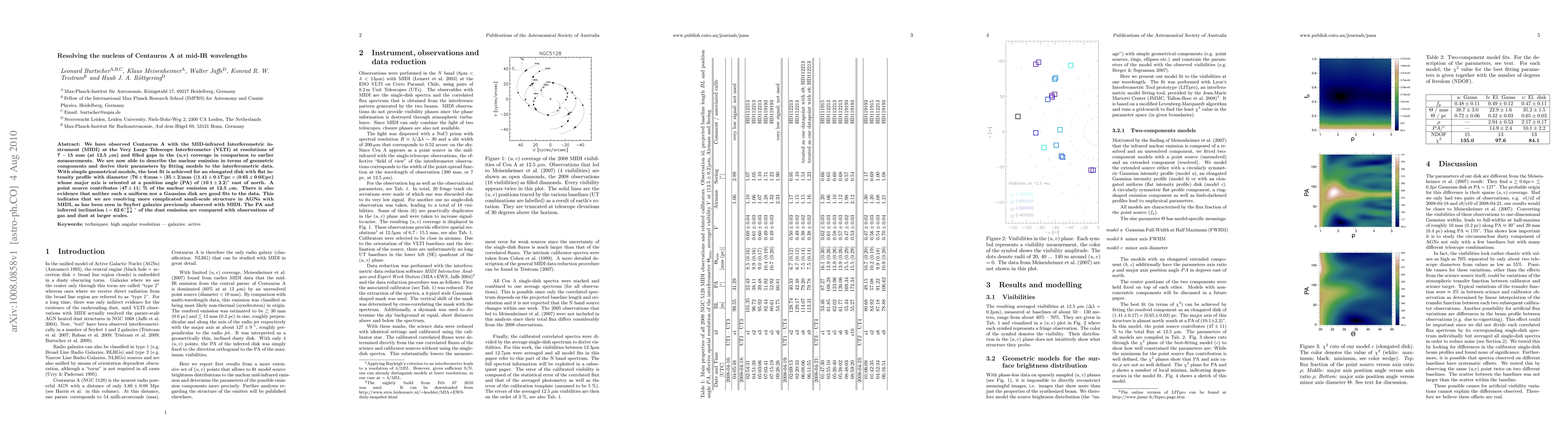 Researchers used the MID-infrared Interferometric instrument to observe Centaurus A, resolving its nuclear emission in terms of geometric components and deriving their parameters. They found an elongated disk with a point source contributing 47% of the emission, with implications for understanding AGN structure and dust emission.