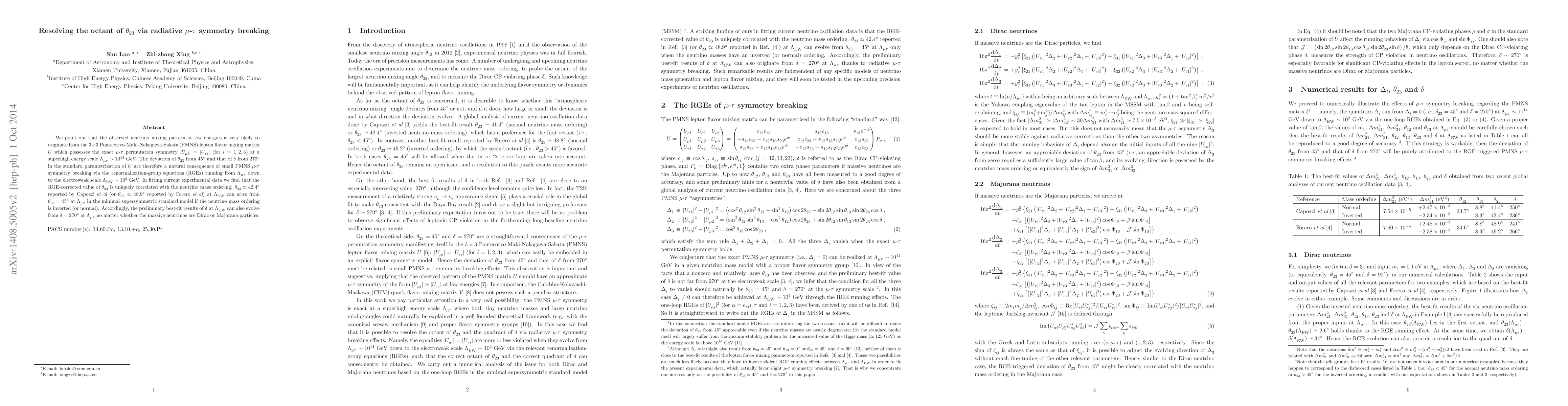 We point out that the observed neutrino mixing pattern at low energies is very likely to originate from the 3 times 3 lepton flavor mixing matrix U which possesses the exact mu-tau permutation symmetry |U_{mu i}| = |U_{tau i}| (for i=1,2,3) at a superhigh energy scale Lambda_{mu tau} \sim 10^{14} GeV. The deviation of theta_{23} from 45^\circ and that of delta from 270^\circ in the standard parametrization of U are therefore a natural consequence of small mu-tau symmetry breaking via the renormalization-group equations (RGEs) running from Lambda_{mu tau} down to the electroweak scale Lambda_{EW} \sim 10^2 GeV. In fitting current experimental data we find that the RGE-corrected value of theta_{23} is uniquely correlated with the neutrino mass ordering: theta_{23} \simeq 42.4^\circ reported by Capozzi et al (or theta_{23} \simeq 48.9^\circ reported by Forero et al) at Lambda_{EW} can arise from theta_{23} = 45^\circ at Lambda_{mu tau} in the minimal supersymmetric standard model if the neutrino mass ordering is inverted (or normal). Accordingly, the preliminary best-fit results of delta at Lambda_{EW} can also evolve from delta = 270^\circ at Lambda_{mu tau} no matter whether the massive neutrinos are Dirac or Majorana particles.