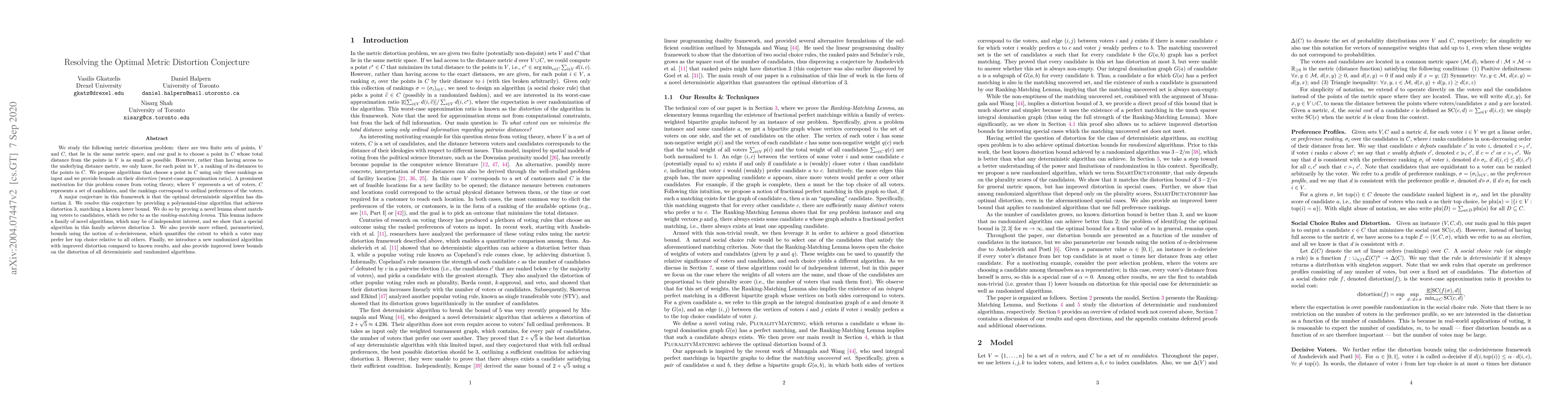 We study the following metric distortion problem: there are two finite sets of points, $V$ and $C$, that lie in the same metric space, and our goal is to choose a point in $C$ whose total distance from the points in $V$ is as small as possible. However, rather than having access to the underlying distance metric, we only know, for each point in $V$, a ranking of its distances to the points in $C$. We propose algorithms that choose a point in $C$ using only these rankings as input and we provide bounds on their \emph{distortion} (worst-case approximation ratio). A prominent motivation for this problem comes from voting theory, where $V$ represents a set of voters, $C$ represents a set of candidates, and the rankings correspond to ordinal preferences of the voters. A major conjecture in this framework is that the optimal deterministic algorithm has distortion $3$. We resolve this conjecture by providing a polynomial-time algorithm that achieves distortion $3$, matching a known lower bound. We do so by proving a novel lemma about matching voters to candidates, which we refer to as the \emph{ranking-matching lemma}. This lemma induces a family of novel algorithms, which may be of independent interest, and we show that a special algorithm in this family achieves distortion $3$. We also provide more refined, parameterized, bounds using the notion of $\alpha$-decisiveness, which quantifies the extent to which a voter may prefer her top choice relative to all others. Finally, we introduce a new randomized algorithm with improved distortion compared to known results, and also provide improved lower bounds on the distortion of all deterministic and randomized algorithms.