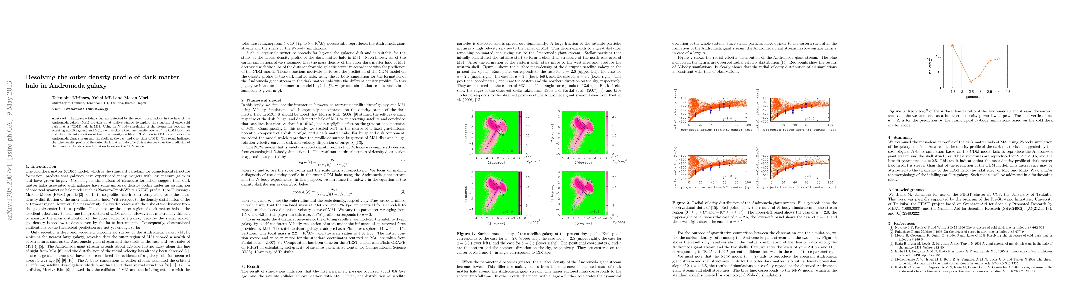 This paper investigates the mass density profile of dark matter in the outer halo of the Andromeda galaxy using N-body simulations. The findings suggest that the density profile is steeper than predicted by the standard cold dark matter model, which helps explain the observed giant stream and shells around M31.