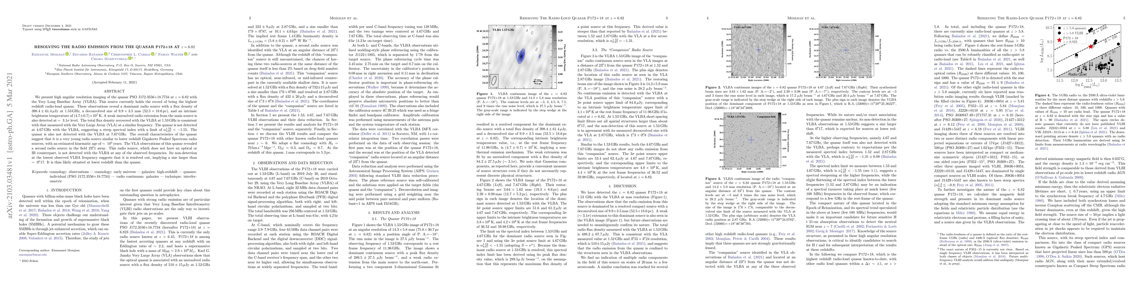 This paper provides high-resolution imaging of the high-redshift quasar P172+18 using the VLBA, revealing a dominant radio source with a steep spectral index and a young kinematic age. A second, larger, unresolved radio source detected with VLA lacks optical or IR counterparts and is likely at a lower redshift.