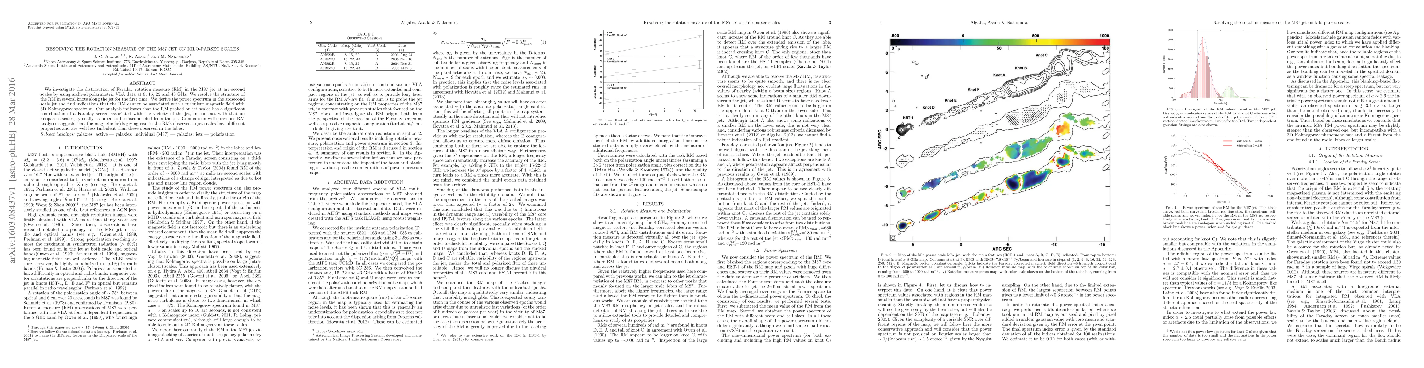 We investigate the distribution of Faraday rotation measure (RM) in the M87 jet at arc-second scales by using archival polarimetric VLA data at 8, 15, 22 and 43 GHz. We resolve the structure of the RM in several knots along the jet for the first time. We derive the power spectrum in the arcsecond scale jet and find indications that the RM cannot be associated with a turbulent magnetic field with 3D Kolmogorov spectrum. Our analysis indicates that the RM probed on jet scales has a significant contribution of a Faraday screen associated with the vicinity of the jet, in contrast with that on kiloparsec scales, typically assumed to be disconnected from the jet. Comparison with previous RM analyses suggests that the magnetic fields giving rise to the RMs observed in jet scales have different properties and are well less turbulent than these observed in the lobes.