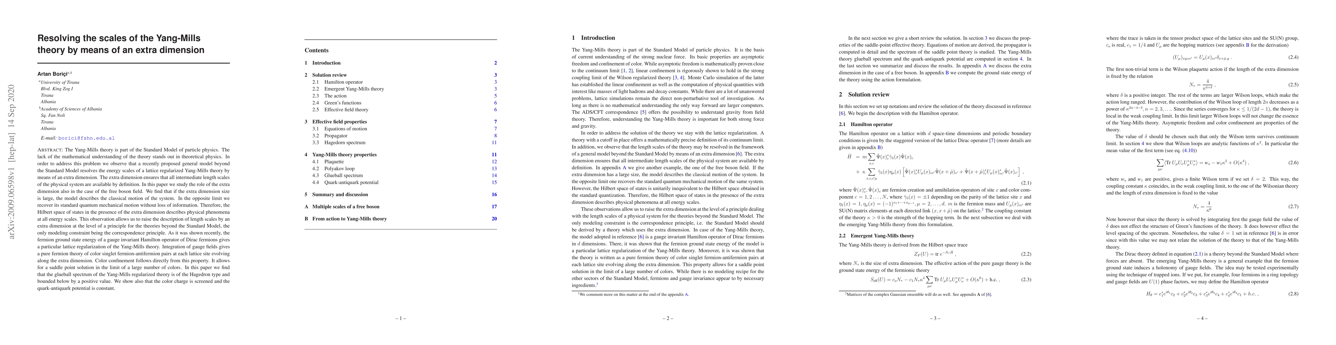 The Yang-Mills theory is part of the Standard Model of particle physics. The lack of the mathematical understanding of the theory stands out in theoretical physics. In order to address this problem we observe that a recently proposed general model beyond the Standard Model resolves the energy scales of a lattice regularized Yang-Mills theory by means of an extra dimension. The extra dimension ensures that all intermediate length scales of the physical system are available by definition. In this paper we study the role of the extra dimension also in the case of the free boson field. We find that if the extra dimension size is large, the model describes the classical motion of the system. In the opposite limit we recover its standard quantum mechanical motion without loss of information. Therefore, the Hilbert space of states in the presence of the extra dimension describes physical phenomena at all energy scales. This observation allows us to raise the description of length scales by an extra dimension at the level of a principle for the theories beyond the Standard Model, the only modeling constraint being the correspondence principle. As it was shown recently, the fermion ground state energy of a gauge invariant Hamilton operator of Dirac fermions gives a particular lattice regularization of the Yang-Mills theory. Integration of gauge fields gives a pure fermion theory of color singlet fermion-antifermion pairs at each lattice site evolving along the extra dimension. Color confinement follows directly from this property. It allows for a saddle point solution in the limit of a large number of colors. In this paper we find that the glueball spectrum of the Yang-Mills regularized theory is of the Hagedron type and bounded below by a positive value. We show also that the color charge is screened and the quark-antiquark potential is constant.
