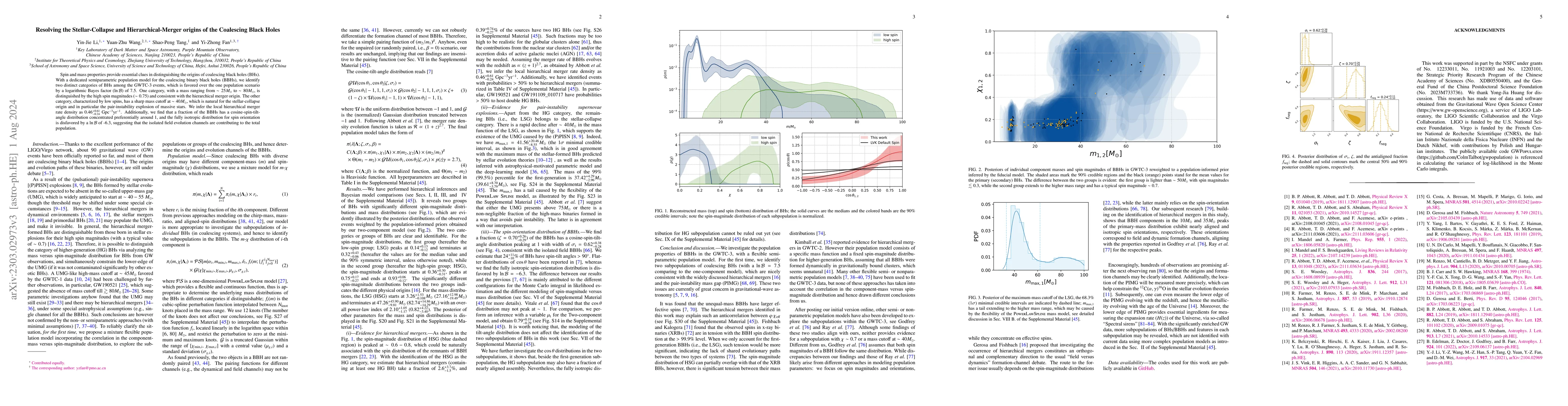 This research distinguishes two origins of coalescing black holes using spin and mass properties: hierarchical mergers for high-spin, massive BHs (~25M☉ to ~80M☉), and stellar collapse for low-spin, smaller BHs (~<40M☉), favoring the two-category model over a single population by a logarithmic Bayes factor of 7.5. The local hierarchical merger rate density is estimated at 0.46^{+0.61}_{-0.24} Gpc^{-3}yr^{-1}.