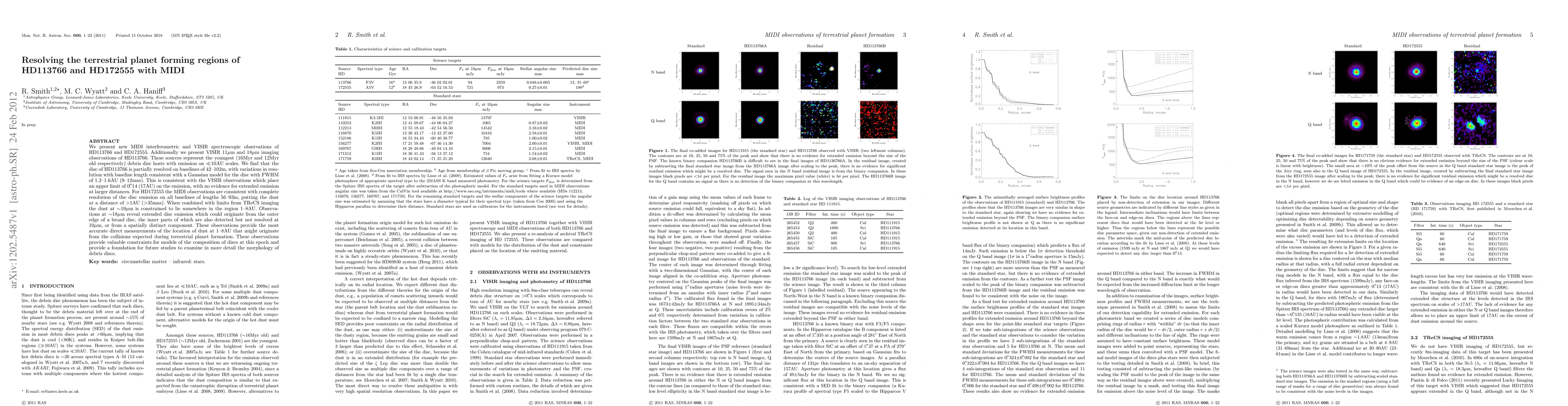 We present new MIDI interferometric and VISIR spectroscopic observations of HD113766 and HD172555. Additionally we present VISIR 11um and 18um imaging observations of HD113766. These sources represent the youngest (16Myr and 12Myr old respectively) debris disc hosts with emission on <<10AU scales. We find that the disc of HD113766 is partially resolved on baselines of 42-102m, with variations in resolution with baseline length consistent with a Gaussian model for the disc with FWHM of 1.2-1.6AU (9-12mas). This is consistent with the VISIR observations which place an upper limit of 0."14 (17AU) on the emission, with no evidence for extended emission at larger distances. For HD172555 the MIDI observations are consistent with complete resolution of the disc emission on all baselines of lengths 56-93m, putting the dust at a distance of >1AU (>35mas). When combined with limits from TReCS imaging the dust at ~10um is constrained to lie somewhere in the region 1-8AU. Observations at ~18um reveal extended disc emission which could originate from the outer edge of a broad disc, the inner parts of which are also detected but not resolved at 10um, or from a spatially distinct component. These observations provide the most accurate direct measurements of the location of dust at 1-8AU that might originate from the collisions expected during terrestrial planet formation. These observations provide valuable constraints for models of the composition of discs at this epoch and provide a foundation for future studies to examine in more detail the morphology of debris discs.