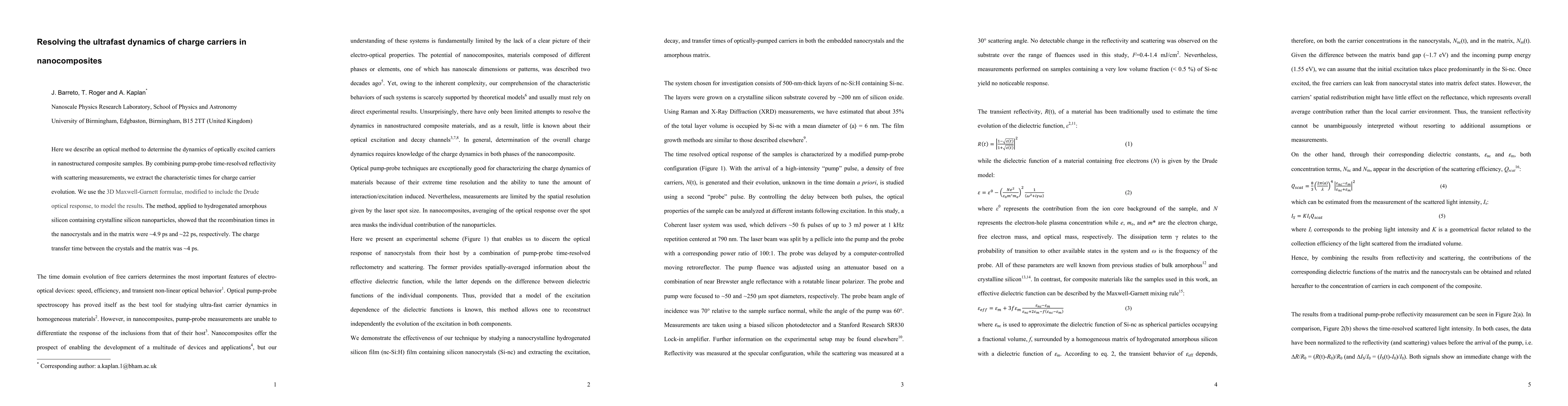 This paper presents an optical method to study the ultrafast dynamics of charge carriers in nanocomposites, revealing recombination times of ~4.9 ps in nanocrystals and ~22 ps in the matrix, with a charge transfer time of ~4 ps between them. The technique combines pump-probe reflectivity and scattering measurements with 3D Maxwell-Garnett models.